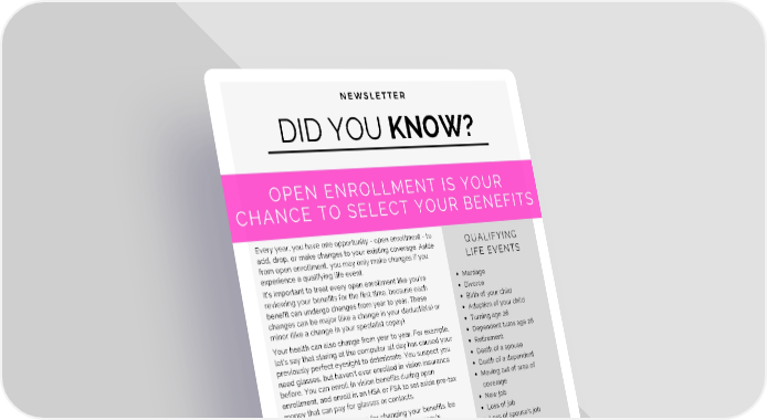 DID YOU KNOW? N E W S L E T T E R Every year, you have one opportunity - open enrollment - to add, drop, or make changes to your existing coverage. Aside from open enrollment, you may only make changes if you experience a qualifying life event. OPEN ENROLLMENT IS YOUR CHANCE TO SELECT YOUR BENEFITS QUALIFYING LIFE EVENTS Marriage Divorce Birth of your child Adoption of your child Turning age 26 Dependent turns age 26 Retirement Death of a spouse Death of a dependent Moving out of area of coverage New job Loss of job Loss of spouse's job It's important to treat every open enrollment like you're reviewing your benefits for the first time, because each benefit can undergo changes from year to year. These changes can be major (like a change in your deductible) or minor (like a change in your specialist copay). Your health can also change from year to year. For example, let's say that staring at the computer all day has caused your previously perfect eyesight to deteriorate. You suspect you need glasses, but haven't ever enrolled in vision insurance before. You can enroll in vision benefits during open enrollment, and enroll in an HSA or FSA to set aside pre-tax money that can pay for glasses or contacts. Whatever reason you have for changing your benefits, be sure to get your elections in during your company's designated open enrollment period! 2020 OPEN ENROLLMENT DATES:
