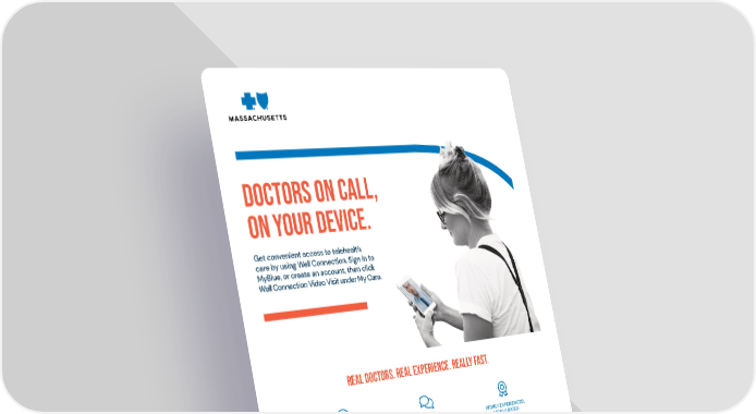 DOCTORS ON CALL, ON YOUR DEVICE. Get convenient access to telehealth care by using Well Connection. Sign in to MyBlue, or create an account, then click Well Connection Video Visit under My Care. REAL DOCTORS. REAL EXPERIENCE. REALLY FAST. CLOCK GET MEDICAL CARE 24/7 Speak face to face with a doctor, in the privacy of your home. 1 comments THERAPY THAT COMES TO YOU Talk to a licensed therapist or psychiatriston your terms. Its convenient and confidential. AWARD HIGHLY EXPERIENCED, HIGHLY RATED Qualified providers. Rated 4.8/5 stars and averaging 15 years of experience. 2 Sign In Download the MyBlue App from the App Store or Google Play TM , or go to bluecrossma.org . Blue Cross Blue Shield of Massachusetts is an Independent Licensee of the Blue Cross and Blue Shield Association. 1. Medical services are available 24/7. Mental health visits must be made by appointment. If your local doctor in the Blue Cross Blue Shield of Massachusetts network offers covered services using live video visits through a service other than Well Connection, youre still covered. This service is only available in the United States. 2. Source: American Well. Amwell Telehealth Report, February 2018. Patient Satisfaction Survey Data compiled December 2017-February 2018. Data, compiled December 2017-February 2018. Data reverified, August 2020.