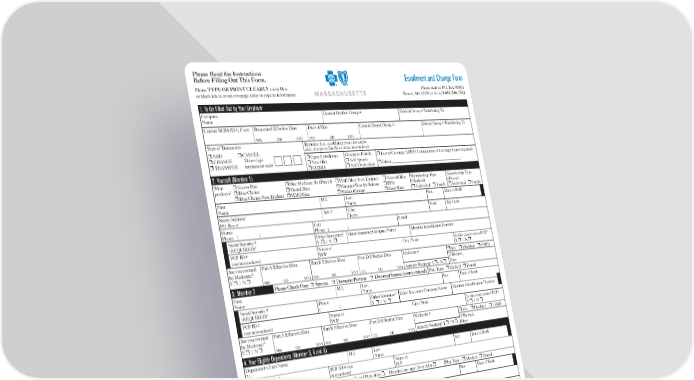 1. To Be Filled Out by Your Employer Company Name Current Medical Group #: Medical Group # Transfering To: Current BCBS ID #, If any Requested Effective Date Date of Hire Current Dental Group #: Dental Group # Transferring To MM DD YYYY MM DD YYYY Type of Transaction ADD CANCEL CHANGE Three digit TRANSFER termination code Remarks: (i.e., qualifying event for a new add, change to family or other instruction) Open Enrollment New Hire COBRA Change to Family Add Spouse Add Dependent Loss of Coverage (HIPAA Continuation of Coverage Letter required) Other: __________________________________________ 2. Yourself (Member 1) What products? Access Blue Blue Choice Blue Choice New England Blue Medicare Rx (Part D) Dental Blue HMO Blue HMO Blue New England Managed Blue for Seniors Medex (Group) Network Blue PPO Saver Blue Membership Type (Medical) Individual Family Membership Type (Dental) Individual Family First Name M.I. Last Name Sex Date of Birth Street Address/ P.O. Box # Apt. # City/ Town State Zip Code Home Phone ( ) Cell Phone ( ) Email Social Security # (REQUIRED) 1 Other Insurance? 2 Y / N Other Insurance Company Name Member Identification Number PCP ID # (see instructions) Name of PCP City / State Is this your current PCP? Y / N Are you covered by Medicare? 2 Y / N Part A Effective Date Part B Effective Date Part D Effective Date Medicare # 65+ Disabled ESRD If Retired, Date MM DD YYYY MM DD YYYY MM DD YYYY Actively Working? Y / N 3. Member 2 Please Check One: Spouse Domestic Partner Divorced Spouse (court ordered) Plan Type: Medical Dental First Name M.I. Last Name Sex Date of Birth Social Security # (REQUIRED) 1 Phone ( ) Other Insurance? 1 Y / N Other Insurance Company Name Member Identification Number PCP ID # (see instructions) Name of PCP City / State Is this your current PCP? Y / N Are you covered by Medicare? 2 Y / N Part A Effective Date Part B Effective Date Part D Effective Date Medicare # 65+ Disabled ESRD MM DD YYYY MM DD YYYY MM DD YYYY If Retired, Date Actively Working? Y / N 4. Your Eligible Dependents (Member 3, 4 and 5) Dependents First Name 3.) M.I. Last Name Sex Date of Birth Social Security # (REQUIRED) 1 PCP ID # (see instructions) Name of PCP Is this your current PCP? Y / N Full-time student and aged 19 or older Disabled and aged 26 or older Plan Type: Medical Dental Dependents First Name 4.) M.I. Last Name Sex Date of Birth Social Security # (REQUIRED) 1 PCP ID # (see instructions) Name of PCP Is this your current PCP? Y / N Full-time student and aged 19 or older Disabled and aged 26 or older Plan Type: Medical Dental Dependents First Name 5.) M.I. Last Name Sex Date of Birth Social Security # (REQUIRED) 1 PCP ID # (see instructions) Name of PCP Is this your current PCP? Y / N Full-time student and aged 19 or older Disabled and aged 26 or older Plan Type: Medical Dental Please check if you are using separate forms for additional dependent children Total # of dependents: _________________________________ 5. Personal Savings Account HSA: Health Savings Account Start Date End Date FSA Goal Amount (Please see instructions for limits.): $ FSA: Health Flexible Spending Account Start Date End Date Health: $ FSA: Dependent Care Reimbursement Account Start Date End Date Dependent Care: $ 6. Signature (Employer & Employee) The information here is complete and true. I understand that Blue Cross and Blue Shield will rely on this information to enroll me and my dependents or to make changes to my membership. I understand that I should read the subscriber certificate or benefit booklet provided by my employer to understand my benefits and any restrictions that apply to my health care plan. I understand that Blue Cross and Blue Shield may obtain personal and medical information about me to carry out its business, and that it may use and disclose that information in accordance with law. I acknowledge that I may obtain further information about the collection, use, and disclosure of my information in Our Commitment to Confidentiality, Blue Cross and Blue Shields notice of privacy practices. Employees Signature __________________________________ Date _____________ Employers Signature ___________________________________ Date _____________ Please Read the Instructions Before Filling Out This Form. Please TYPE OR PRINT CLEARLY using blue or black ink to avoid coverage delay or type in information Enrollment and Change Form Please mail to: P.O. Box 986001 Boston, MA 02298 or fax to 1-617-246-7531 Blue Cross Blue Shield of Massachusetts is an Independent Licence of the Blue Cross and Blue Shield Association. 1. REQUIRED: Under the Affordable Care Act, we are required to collect the Social Security number for you and any dependent enrolling in your plan.