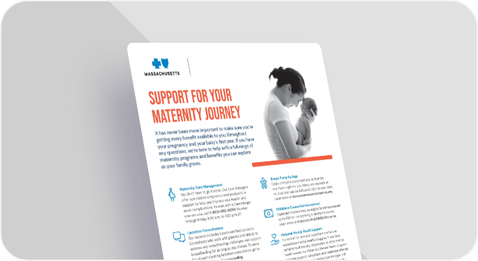Maternity Care Management You dont have to go it alone. Our Care Managers offer specialized pregnancy and postpartum support to help you improve your health and avoid complications. To work with a Care Manger one-on-one, call 1-800-392-0098 Monday through Friday, 8:30 a.m. to 4:30 p.m. ET. Lactation Consultations Our network includes board-certified Lactation Consultants who work with parents and infants to address any breastfeeding challenges, and support breastfeeding for as long as you choose. To see a list of participating lactation consultants, go to bcbsma.info/lactationcounseling . 24/7 Nurse Line If you have questions about your newborn, yourself, or need other medical advice, connect directly to a nurse 24/7. Get immediate adviceno waiting for a callback. Call 1-888-247-BLUE (2583) . baby Breast Pump Savings Easily compare pump features to find the one thats right for you. Many are available at no cost and can be delivered right to your door. Learn more at bluecrossma.com/breast-pump . Childbirth Course Reimbursement Expectant mothers may be eligible for reimbursement up to $90 for completing a childbirth course. Learn more at bcbsma.info/childbirthcourse . hand-holding-heart Maternal Mental Health Support Its normal for new and expectant mothers to experience mental health struggles. If you have symptoms of anxiety, depression, or other mental health issues, our Maternity Mental Health program provides support, education, and treatment referrals. To speak with a Mental Health Care Manager, call 1-800-524-4010 , ext. 62398 , Monday through Friday, 8:30 a.m. to 4:30 p.m. ET. SUPPORT FOR YOUR MATERNITY JOURNEY It has never been more important to make sure youre getting every benefit available to you, throughout your pregnancy and your babys first year. If you have any questions, were here to help with a full range of maternity programs and benefits you can explore as your family grows. To see all your maternity benefits in one place, visit bluecrossma.org/maternity . Learn More Blue Cross Blue Shield of Massachusetts is an Independent Licensee of the Blue Cross and Blue Shield Association.