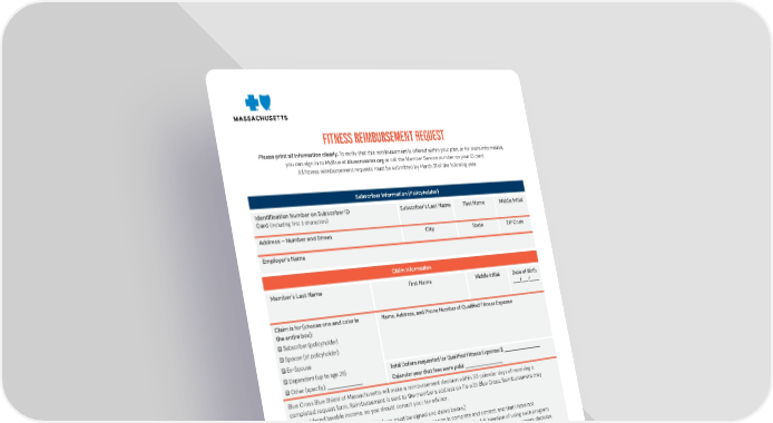 Fitness Reimbursement Request Please print all information clearly. To verify that this reimbursement is offered within your plan, or for more information, you can sign in to MyBlue at bluecrossma.org or call the Member Service number on your ID card. All fitness reimbursement requests must be submitted by March 31 of the following year. Subscriber Information (Policyholder) Identification Number on Subscriber ID Card (including fir st 3 characters) Subscriber's Last Name First Name Middle Initial Address Number and Street City State ZIP Code Employers Name Claim Information Member's Last Name First Name Middle Initial Date of Birth ___/ ___/____ Claim is for (choose one and color in the entire box): Subscriber (policyholder) ________________ _____________ ________________ /___ / _ ___ ___ Spouse(of policyholder) Ex-Spouse Dependent (up to age 26) Other (specify): Name, Address, and Phone Number of Qualified Fitness Expense Total Dollars requested for Qualified Fitness Expense: $ Calendar year that fees were paid: Blue Cross Blue Shield of Massachusetts will make a reimbursement decision within 30 calendar days of receiving a completed request form. Reimbursement is sent to the member's address on file with Blue Cr oss. Reimbursement may be considered taxable income, so you should consult your tax advisor. Certification and Authorization (This form must be signed and dated below.) I certify that the information provided in support of this submission is complete and correct, and that I have not previously submitted for these services. I enrolled in the qualified pro gram with the full intention of using such program. I understand that Blue Cross Blue Shield of Massachusetts may require proof of payment for a reimbursement decision. I authorize the release of any information about my qualified fitness pr ogram to Blue Cross Blue Shield of Massachusetts. Subscribers or Members Signature: Date: Complete this form and mail it to: Blue Cross Blue Shield of Massachusetts, Local Claims Department, PO Box 986030, Boston, MA 02298 Blue Cross Blue Shield of Massachusetts complies with applicable federal civil rights laws and does not discriminate on the basis of race, color, national origin, age, disability, sex, sexual orientation, or gender identity. ATTENTION: If you dont speak English, language assistance services, free of charge, are available to you. Call Member Service at the number on your ID card (TTY: 711 ). ATENCIN: Si habla espaol, tiene a su disposicin servicios gratuitos de asistencia con el idioma. Llame al nmero de Servicio al Cliente que figura en su tarj ta de identificacin (TT Y : 711 ). ATENO: Se fala portugus, so-lhe disponibilizados gratuitamente servios de assistncia de idiomas. Telefone para os Servios aos Membros, atravs do nmero no seu carto ID (TTY: 711 ). 000891752 ( 2 /2 2 ) Blue Cross Blue Shield of Massachusetts is an Independent Licensee of the Blue Cross and Blue Shield Association. Registered Marks of the Blue Cross and Blue Shield Association. Registered Marks and TM Trademarks are the property of their respective owners. 202 2 Blue Cross and Blue Shield of Massachusetts, Inc., or Blue Cross and Blue Shield of Massachusetts HMO Blue, Inc.