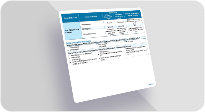 Page 6 of 8 Common Medical Event Services You May Need What You Will Pay Limitations, Exceptions, & Other Important Information In-Network (You will pay the least) Out-of-Network (You will pay the most) If your child needs dental or eye care Childrens eye exam No charge 20% coinsurance Deductible applies first for out-of- network; limited to one exam every 24 months Childrens glasses Not covered Not covered None Childrens dental check-up No charge for members with a cleft palate / cleft lip condition 20% coinsurance for members with a cleft palate / cleft lip condition Deductible applies first for out-of- network; limited to members under age 18 Excluded Services & Other Covered Services: Services Your Plan Generally Does NOT Cover (Check your policy or plan document for more information and a list of any other excluded services.) Children's glasses Cosmetic surgery Dental care (Adult) Long - term care Private - duty nursing Other Covered Services (Limitations may apply to these services. This isnt a complete list. Please see your plan document.) Acupuncture (12 visits per calendar year) Bariatric surgery Chiropractic care Hearing aids ($2,000 per ear every 36 months for members age 21 or younger) Infertility treatment Non-emergency care when traveling outside the U.S. Routine eye care - adult (one exam every 24 months) Routine foot care (only for patients with systemic circulatory disease) Weight loss programs ($150 per calendar year per policy)