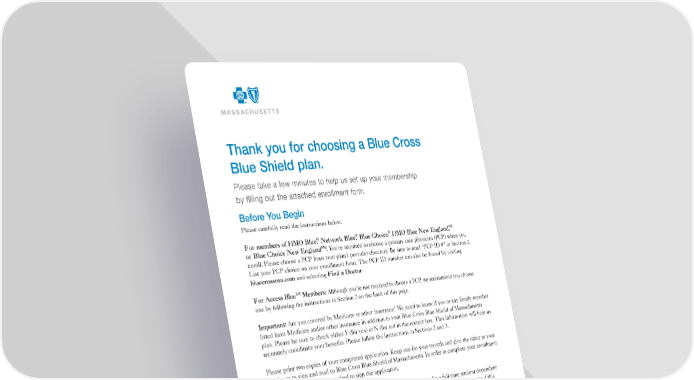 Blue Cross Blue Shield of Massachusetts is an Independent Licensee of the Blue Cross and Blue Shield Association. , SM Registered Marks and Service Marks of the Blue Cross and Blue Shield Association. 2017 Blue Cross and Blue Shield of Massachusetts, Inc., and Blue Cross and Blue Shield of Massachusetts HMO Blue, Inc. 163537 36-3630 (11/17) Thank you for choosing a Blue Cross Blue Shield plan. Please take a few minutes to help us set up your membership by filling out the attached enrollment form. Before You Begin Please carefully read the instructions below. For members of HMO Blue, Network Blue, Blue Choice, HMO Blue New England, SM or Blue Choice New England SM : Youre required to choose a primary care physician (PCP) when you enroll. Please choose a PCP from your plans provider directory. Be sure to read PCP ID # in Section 2. List your PCP choice on your enrollment form. The PCP ID number can also be found by visiting bluecrossma.com and selecting Find a Doctor . For Access Blue SM Members: Although youre not required to choose a PCP, we recommend you choose one by following the instructions in Section 2 on the back of this page. Important: Are you covered by Medicare or other insurance? We need to know if you or any family member listed have Medicare and/or other insurance in addition to your Blue Cross Blue Shield of Massachusetts plan. Please be sure to check either Y (for yes) or N (for no) in the correct box. This information will help us accurately coordinate your benefits. Please follow the instructions in Sections 2 and 3. Please print two copies of your completed application. Keep one for your records and give the other to your employer to sign and mail to Blue Cross Blue Shield of Massachusetts. In order to complete your enrollment request, your employer is required to sign the application. Special Instructions for Student Coverage : If youre seeking coverage for a full-time student dependent over age 19, you may need to fill out a Student Certificate form. Check with your employer to see if this coverage is available. Blue Cross Blue Shield of Massachusetts P.O. Box 986001 Boston, MA 02298 Fax: 1-617-246-7531
