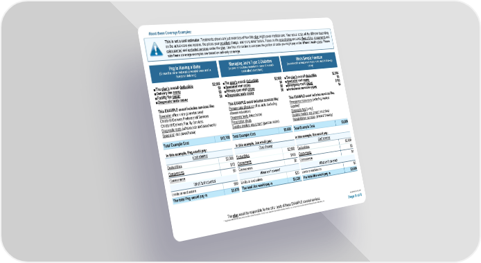 About these Coverage Examples: This is not a cost estimator. Treatments shown are just examples of how this plan might cover medical care. Your actual costs will be different depending on the actual care you receive, the prices your providers charge, and many other factors. Focus on the cost-sharing amounts (deductibles, copayments and coinsurance) and excluded services under the plan. Use this information to compare the portion of costs you might pay under different health plans. Please note these coverage examples are based on self-only coverage. Peg is Having a Baby (9 months of in - network prenatal care and a hospital delivery) The plan s overall deductible $2,900 Delivery fee copay $0 Facility fee copay $0 Diagnostic tests copay $0 This EXAMPLE event includes services like: Specialist office visits (prenatal care) Childbirth/Delivery Professional Services Childbirth/Delivery Facility Services Diagnostic tests (ultrasounds and blood work) Specialist visit (anesthesia) Total Example Cost $12,700 In this example, Peg would pay: Cost sharing Deductibles $2,900 Copayments $10 Coinsurance $0 What isnt covered Limits or exclusions $60 The total Peg would pay is $2,970 Managing Joe's Type 2 Diabetes (a year of routine in - network care of a well - controlled condition) The plan s overall deductible $2,900 Specialist visit copay $0 Primary care visit copay $0 Diagnostic tests copay $0 This EXAMPLE event includes services like: Primary care physician office visits (including disease education) Diagnostic tests (blood work) Prescription drugs Durable medical equipment (glucose meter) Total Example Cost $5,600 In this example, Joe would pay: Cost sharing Deductibles $2,900 Copayments $400 Coinsurance $0 What isnt covered Limits or exclusions $20 The total Joe would pay is $3,320 Mias Simple Fracture (in - network emergency room visit and follow - up care) The plan s overall deductible $2,900 Specialist visit copay $0 Emergency room copay $150 Ambulance services copay $0 This EXAMPLE event includes services like: Emergency room care (including medical supplies) Diagnostic test ( x-ray ) Durable medical equipment (crutches) Rehabilitation services (physical therapy) Total Example Cost $2,800 In this example, Mia would pay: Cost sharing Deductibles $2,800 Copayments $0 Coinsurance $0 What isnt covered Limits or exclusions $0 The total Mia would pay is $2,800 The plan would be responsible for the other costs of these EXAMPLE covered services. 003409050 (3/25) GSP Registered Marks of the Blue Cross and Blue Shield Association. 2025 Blue Cross and Blue Shield of Massachusetts, Inc., or Blue Cross and Blue Shield of Massachusetts HMO Blue, Inc. Page 8 of 8