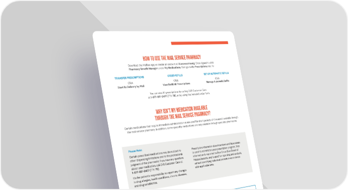 If you have any questions, call CVS Customer Care at 1-877-817-0477 (TTY: 711 ). Questions? Blue Cross Blue Shield of Massachusetts complies with applicable federal civil rights laws and does not discriminate on the basis of race, color, national origin, age, disability, sex, sexual orientation, or gender identity. ATTENTION: If you dont speak English, language assistance services, free of charge, are available to you. Call Member Service at the number on your ID card (TTY: 711 ). ATENCIN: Si habla espaol, tiene a su disposicin servicios gratuitos de asistencia con el idioma. Llame al nmero de Servicio al Cliente que figura en su tarjeta de identificacin (TTY: 711 ). ATENO: Se fala portugus, so-lhe disponibilizados gratuitamente servios de assistncia de idiomas. Telefone para os Servios aos Membros, atravs do nmero no seu carto ID (TTY: 711 ). CaremarkPCS Health, LLC (CVS Caremark) is an independent company that has been contracted to administer pharmacy benefits and provide certain pharmacy services for Blue Cross Blue Shield of Massachusetts. CVS Caremark is part of the CVS Health family of companies. Blue Cross Blue Shield of Massachusetts is an Independent Licensee of the Blue Cross and Blue Shield Association. Registered Marks of the Blue Cross and Blue Shield Association. 2022 Blue Cross and Blue Shield of Massachusetts, Inc., or Blue Cross and Blue Shield of Massachusetts HMO Blue, Inc. 001542278 55-001542278 (10/22) Certain medications that require immediate administration or are used for short periods of time arent available through the mail service pharmacy. In addition, some specialty medications are only available through specialty pharmacies. WHY ISNT MY MEDICATION AVAILABLE THROUGH THE MAIL SERVICE PHARMACY? Certain prescribed medications may be subject to other dispensing limitations and to the professional judgment of the pharmacist. If you have any questions about your medication, call CVS Customer Care at 1-877-817-0477 (TTY: 711 ). Its the patients responsibility to report any changes in drug allergies, health conditions, chronic diseases, and drug sensitivities. Prescription information about members and dependents is used to administer your prescription program. That information is reported to Blue Cross Blue Shield of Massachusetts, and is used for reporting and analysis, without identifying individual patients in accordance with applicable laws. Please Note: You can also fill prescriptions by calling CVS Customer Care at 1-877-817-0477 (TTY: 711 ), or by using the included order form. HOW TO USE THE MAIL SERVICE PHARMACY TRANSFER PRESCRIPTIONS Click Start Rx Delivery by Mail ORDER REFILLS Click View/Refill All Prescriptions SET UP AUTOMATIC REFILLS Click Manage Automatic Refills Download the MyBlue app or create an account at bluecrossma.org . Once signed in, click Pharmacy Benefit Manager under My Medications, then go to the Prescriptions tab. To: