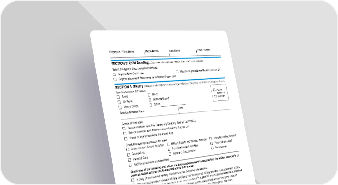 Page 4 of 5 Fs/f PFML-CERT-FORM (12/21) Employee - First Name Middle Name Last Name Claim Number SECTION 3: Child Bonding: (Only complete if leave reason is to bond with a child) Select the type of documentation provided. Copy of Birth Certificate Healthcare provider certification (Section 2) Copy of placement documents for Adoption/Foster care SECTION 4: Military (Only complete if leave reason is for Military Exigency or Military Caregiver leave) Service Member Affiliation: Army Navy Air Force National Guard Marine Corps Other: Active Reserves Veteran Service Member Rank Unit Check all that apply Service member is on the Temporary Disability Retired List (TDRL) Service member is on the Permanent Disability Retired List Illness or Injury incurred in the line of duty Check the appropriate reason for leave Childcare and School Activities Military Events and Related Activities Short Notice Deployment Counseling Post Deployment Activities Financial and Legal Parental Care Rest and Recuperation Bereavement Additional activities as described Check one of the following and attach the indicated document to support that the military member is on covered active duty or call to covered active duty status: A copy of the covered military member's active duty orders is attached. Other documentation from the military certifying that the covered military member is on active duty orders (or has been notified of an impending call to active duty) in support of a contingency operation is attached. I have previously provided my employer with sufficient written documentation confirming the covered military member's active duty or call to active duty status in support of a contingency operation.