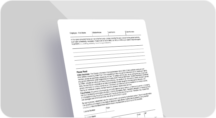 Page 3 of 5 Fs/f PFML-CERT-FORM (12/21) Employee - First Name Middle Name Last Name Claim Number In the space provided below or in an attached page, please describe the care needed for the patient and why such care is medically necessary. If care is for an adult child, List ADLs or IADLs your patient requires support to perform (i.e., cooking, toileting, travel to appointments) . Please Read: GINA Disclaimer: The Genetic Information Nondiscrimination Act of 2008 (GINA) prohibits employers and other entities covered by GINA Title II from requesting or requiring genetic information of an individual or family member, except as specifically allowed by this law. To comply with this law, we are asking that you not provide any genetic information when responding to this request for medical information. Genetic Information as defined by GINA, includes an individual’s family medical history, the results of an individual’s or family member’s genetic tests, the fact that an individual or an individual’s family member sought or received genetic services, and genetic information of a fetus carried by an individual or an individual’s family member or an embryo lawfully held by an individual or family member receiving assistive reproductive services. Fraud Notice: Any person who knowingly and with intent to injure, defraud, or deceive any person, or knowing that he is facilitating commission of a fraud, submits incomplete, false, fraudulent, deceptive or misleading facts or information is/may be guilty of a crime and may be prosecuted and punished. Penalties may include fines, civil damages and criminal penalties, including confinement in prison. By signing below, I attest that I am the treating health care provider to the listed patient. The clinical information I am providing is in regard to the dates of absences listed above. I certify that my patient’s family member (employee) must be absent from work or have a modified work schedule due to this condition. License Number State Business Name Address City State ZIP Phone Number Email Signature of Heathcare Provider Date (mm/dd/yyyy)
