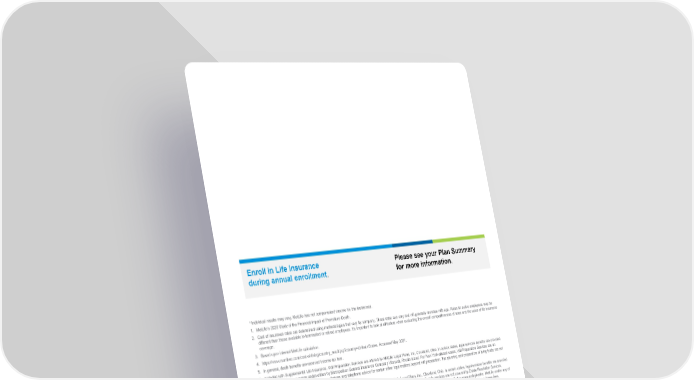 Enroll in Life Insurance Please see your Plan Summary during annual enrollment. for more information. * Individual results may vary. MetLife has not compensated anyone for this testimonial. 1. MetLife’s 2020 Study of the Financial Impact of Premature Death. 2. Cost of insurance rates are determined using methodologies that vary by company. These rates can vary and will generally increase with age. Rates for active employees may be different than those available to terminated or retired employees. It’s important to look at all factors when evaluating the overall competitiveness of rates and the value of life insurance coverage. 3. Based upon internal MetLife calculation. 4. https://www.numbeo.com/cost-of-living/country_result.jsp?country=United+States. Accessed May 2021. 5. In general, death benefits are received income tax free. 6. Included with Supplemental Life Insurance. Will Preparation Services are offered by MetLife Legal Plans, Inc, Cleveland, Ohio. In certain states, legal services benefits are provided through insurance coverage underwritten by Metropolitan General Insurance Company Warwick, Rhode Island. For New York-sitused cases, Will Preparation Services are an expanded offering that includes office consultations and telephone advice for certain other legal matters beyond will preparation. Tax planning and preparation of living trusts are not covered by Will Preparation Services. 7. Included with Supplemental Life Insurance. Estate Resolution Services are offered by MetLife Legal Plans, Inc., Cleveland, Ohio. In certain states, legal services benefits are provided through insurance coverage underwritten by Metropolitan General Insurance Company Warwick, Rhode Island. Certain services are not covered by Estate Resolution Services, including matters in which there is a conflict of interest between the executor and any beneficiary or heir and the estate; any disputes with the group policyholder, MetLife and/or any of its affiliates; any disputes involving statutory benefits; will contests or litigation outside probate court; appeals; court costs, filing fees, recording fees, transcripts, witness fees, expenses to a third party, judgments or fines; and frivolous or unethical matters. 8. All coverage amounts are subject to applicable state laws. To take advantage of this benefit, coverage of at least $10,000 or $20,000 must be elected. 9. Cost of insurance rates are determined using methodologies that vary by company. These rates can vary and will generally increase with age. Rates for active employees may be different than those available to terminated or retired employees. It’s important to look at all factors when evaluating the overall competitiveness of rates and the value of life insurance coverage. 10. Services and discounts are provided through a member of the Dignity Memorial® Network, a brand name used to identify a network of licensed funeral, cremation and cemetery providers that are affiliates of Service Corporation International (together with its affiliates, “SCI”), 1929 Allen Parkway, Houston, Texas. The online planning site is provided by SCI Shared Resources, LLC. SCI is not affiliated with MetLife, and the services provided by Dignity Memorial members are separate and apart from the insurance provided by MetLife. Not available in some states. Planning services, expert assistance, and bereavement travel services are available to anyone regardless of affiliation with MetLife. Discounts through Dignity Memorial’s network of funeral providers are pre-negotiated. Not available where prohibited by law. The discount is available for services offered in any state except KY and NY, or where there is no Dignity Memorial presence (AK, MT, ND, SD, and WY). For MI and TN, the discount is available for “At Need” services only. For coverage issued under a multiple-employer trust, services are not available for WA residents. Nothing in these materials is intended to be advice for a particular situation or individual. Please consult with your own advisors for such advice. Like most group insurance policies, insurance policies offered by MetLife contain certain exclusions, exceptions, waiting periods, reductions, limitations and terms for keeping them in force. Please contact your benefits administrator or MetLife for costs and complete details. Life coverages are provided under a group insurance policy (Policy Form GPN99 or G2130-S) issued to your employer by MetLife. Life coverages under your employer’s plan terminates when your employment ceases, when your Life contributions cease, or upon termination of the group insurance policy. Dependent Life coverage will terminate when a dependent no longer qualifies as a dependent. Should your life insurance coverage terminate, for reasons other than non-payment of premium, you may convert it to a MetLife individual permanent policy without providing medical evidence of insurability. Metropolitan Life Insurance Company | 200 Park Avenue | New York, NY 10166 L0623032862[exp0625][All States] © 2023 MetLife Services and Solutions, LLC