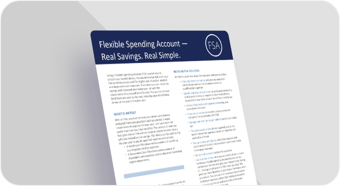 Flexible Spending Account — Real Savings. Real Simple. Using a Flexible Spending Account (FSA) is great way to WITH AN FSA YOU CAN: stretch your benefit dollars. You use before-tax dollars in your An FSA is a great way to pay for expenses with pre-tax dollars. FSA to reimburse yourself for eligible out-of-pocket medical • Enjoy significant tax savings with pre-tax deductible and dependent care expenses. That means you can enjoy tax contributions and tax-free reimbursements for savings and increased take-home pay—all with the qualified plan expenses convenience of a prepaid benefits card. Plus you can rollover $610 from one year to the next, reducing your risk of losing • Quickly and easily access funds using the prepaid benefits dollars at the end of the plan year. card at point of sale, or request to have funds directly deposited to your bank account via online or mobile app WHAT IS AN FSA? • Reduce filing hassles and paperwork by using your prepaid benefits card With an FSA, you elect to have your annual contribution • Enjoy secure access to accounts using a convenient deducted from your paycheck each pay period, in equal Consumer Portal available 24/7/365 installments throughout the plan year, until you reach the • Manage your FSA “on the go” with an easy-to-use mobile yearly maximum you have specified. The amount of your pay app that goes into an FSA will not count as taxable income, so you will have immediate tax savings. FSA dollars can be used during • File claims easily online (when required) and let the the plan year to pay for qualified expenses and services. system determine approval based on eligibility and • A Healthcare FSA allows reimbursement of qualifying availability of funds out-of-pocket medical expenses. • Stay up to date on balances and action required with • A Dependent Care FSA allows reimbursement of automated email alert and convenient portal and mobile dependent care expenses, such as daycare) incurred by home page messages eligible dependents. • Get one-click answers to benefits questions • Use it or Roll It Over. And now up to $610 of your unused healthcare Flexible Spending Account balance can be carried over into the next plan year instead of you “losing it” - making enrollment in an FSA much less risky. This gives you more flexibility to spend your FSA money when With all FSA account types, you’ll receive access to a secure, you need it. You can use it for necessary out-of-pocket easy-to-use web portal where you can track your account healthcare expenses, rather than feeling pressured to balance, view your investment accounts and submit requests engage in last minute and potentially unnecessary for reimbursements. spending at the end of the year. In addition, you’ll receive a convenient prepaid benefits card to make it easy to pay for eligible services and products not covered by your health insurance. When you use the card, payments are automatically withdrawn from your account. Just swipe the card and go. It’s that easy! Save your receipts! Most expenses can be validated through the card transaction, but you may be prompted to provide a copy of the receipt for certain transactions in accordance to IRS regulations. When required, receipts can be easily sent uploaded to either the consumer portal online or, through the mobile app. It’s as simple as taking a picture of the receipt using the camera on your mobile device! ©2019 All Rights Reserved WEX, Inc.