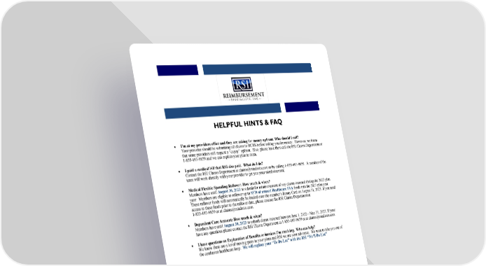 HELPFUL HINTS & FAQ • I’m at my providers office and they are asking for money upfront. Who should I call? Your provider should be submitting all claims to BCBS before asking you for money. However, we know that some providers still request a “copay” upfront. If so, please have them call the RSI Claims Department at 1-855-493-9859 and we can explain your plan to them. • I paid a medical bill that RSI also paid. What do I do? Contact the RSI Claims Department at [email protected] or by calling 1-855-493-9859. A member of the team will work directly with your provider to get you your reimbursement. • Medical Flexible Spending Rollover: How much & when? Members have until August 30, 2023 to submit for reimbursement of any claims incurred during the 2022 plan year. Members are eligible to rollover up to $570 of unused Healthcare FSA funds into the 2023 plan year. These rollover funds will automatically be loaded onto the member’s Benny Card on August 31, 2023. If you need access to these funds prior to the rollover date, please contact the RSI Claims Department at 1-855-493-9859 or at [email protected]. • Dependent Care Account: How much & when? Members have until August 30, 2023 to submit claims incurred between June 1, 2022—May 31, 2023. If your have any questions please contact the RSI Claims Department at 1-855-493-9859 or at [email protected]. • I have questions on Explanation of Benefits or invoices I’m receiving. Who can help? We know there are a lot of moving parts to your plans and RSI we are your advocate. We want to take you out of the confusion healthcare loop. We will replace your “To Do List” with the RSI “We’ll Do List”