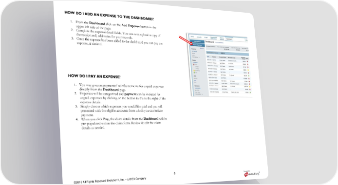 5 ©2015 All Rights Reserved Evolution1, Inc. – a WEX Company 0315 HOW DO I ADD AN EXPENSE TO THE DASHBOARD? 1. From the Dashboard click on the Add Expense button in the upper left side of the page. 2. Complete the expense detail fields. You can even upload a copy of the receipt and, add notes for your records. 3. Once the expense has been added to the dashboard you can pay the expense, if desired. HOW DO I PAY AN EXPENSE? 1. You may process payments/ reimbursements for unpaid expenses directly from the Dashboard page. 2. Expenses will be categorized and payment can be initiated for unpaid expenses by clicking on the button to the to the right of the expense details. 3. Simply choose which expenses you would like paid and you will presented with the eligible accounts from which you can initiate payment. 4. When you click Pay, the claim details from the Dashboard will be pre-populated within the claim form. Review & edit the claim details as needed.