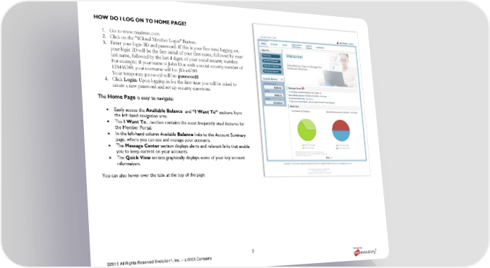 2 ©2015 All Rights Reserved Evolution1, Inc. – a WEX Company 0315 HOW DO I LOG ON TO HOME PAGE? 1. Go to www.rsiadmin.com 2. Click on the "1Cloud Member Login" Button. 3. Enter your login ID and password. If this is your first time logging on, your login ID will be the first initial of your first name, followed by your last name, followed by the last 4 digits of your social security number. For example: If your name is John Doe with a social security number of 123456789, your username will be: JDoe6789 Your temporary password will be: password1 4. Click Login. Upon logging in for the first time you will be asked to create a new password and set up security questions. The Home Page is easy to navigate: Easily access the Available Balance and “I Want To” sections from the left-hand navigation area. The I Want To…section contains the most frequently used features for the Member Portal. In the left-hand column Available Balance links to the Account Summary page, where you can see and manage your accounts. The Message Center section displays alerts and relevant links that enable you to keep current on your accounts. The Quick View section graphically displays some of your key account information. You can also hover over the tabs at the top of the page.