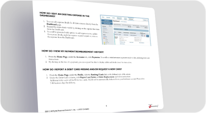 6 ©2015 All Rights Reserved Evolution1, Inc. – a WEX Company 0315 HOW DO I EDIT AN EXISTING EXPENSE IN THE DASHBOARD? 1. You can edit expense details for all claim statuses directly from the Dashboard page. 2. Expand the claim details visible by clicking on the expense line item from the Dashboard. 3. You will be presented with options to add expense notes, update the expense details, mark the expense as paid/unpaid or, remove the expense from the Dashboard. HOW DO I VIEW MY PAYMENT/REIMBURSEMENT HISTORY? 1. From the Home Page, under the Accounts tab, click Payments. You will see reimbursement payments made to date, including debit card transactions. 2. By clicking on the line of a payment, you can expand the data to display additional details about the transaction. HOW DO I REPORT A DEBIT CARD MISSING AND/OR REQUEST A NEW CARD? 1. From the Home Page, under the Profile, click the Banking/Cards link on the lefthand side of the screen. 2. Under the Debit Cards column, click Report Lost/Stolen or Order Replacement and follow instructions. Additional debit cards will be $5 for two cards. The $5 will be automatically deducted from your helathcare account. Please allow 7-10 business days for delivery.