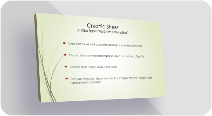 Chronic Stress Dr. Ellisa Eppel “The Stress Prescription” Stress can be viewed as a sprint (acute) or marathon (chronic) Chronic stress may be prolonged situation or made up of sprints Chronic stress is toxic stress in the body One way stress can become chronic is through intrusive thoughts and rumination of a situation 6