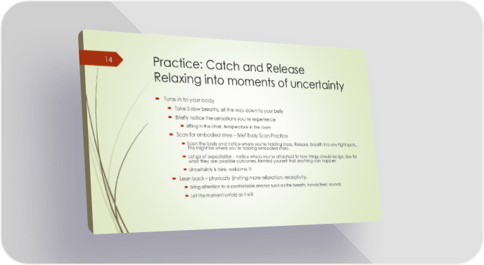Practice: Catch and Release Relaxing into moments of uncertainty Tune in to your body Take 3 slow breaths, all the way down to your belly Briefly notice the sensations you’re experience sitting in the chair, temperature in the room Scan for embodied stress – Brief Body Scan Practice Scan the body and notice where you’re holding stress. Release, breath into any tight spots. This might be where you’re holding embodied stress Let go of expectation – notice where you’re attached to how things should be/go. See for what they are: possible outcomes. Remind yourself that anything can happen Uncertainty is here, welcome it! Lean back – physically (inviting more relaxation, receptivity. Bring attention to a comfortable anchor such as the breath, hands/feet, sounds Let the moment unfold as it will 14