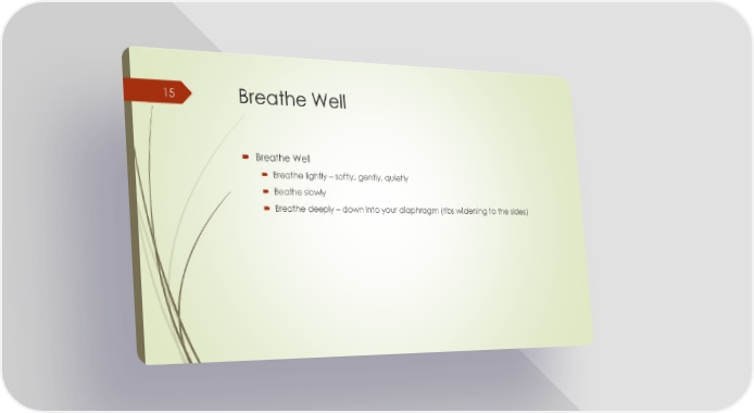 Breathe Well Breathe Well Breathe lightly – softly, gently, quietly Beathe slowly Breathe deeply – down into your diaphragm (ribs widening to the sides) 15