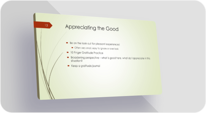 Appreciating the Good Be on the look out for pleasant experiences! Often very small, easy to ignore or over look 10 Finger Gratitude Practice Broadening perspective – what is good here, what do I appreciate in this situation? Keep a gratitude journal 13