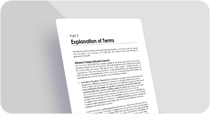 WORDS IN ITALICS ARE EXPLAINED IN PART 2. Page 8 Part 2 Explanation of Terms The following words are shown in italics in this Subscriber Certificate, your Schedule of Benefits, and any riders that apply to your coverage in this health plan. The meaning of these words will help you understand your benefits. Allowed Charge (Allowed Amount) Blue Cross Blue Shield HMO Blue calculates payment of your benefits based on the allowed charge (sometimes referred to as the allowed amount). This is the maximum amount on which payment is based for covered health care services. This may be called “eligible expense,” “payment allowance,” or “negotiated rate.” The allowed charge that Blue Cross Blue Shield HMO Blue uses depends on the type of health care provider that furnishes the covered service to you. If your health care provider charges you more than the allowed amount, you may have to pay the difference (see below). For Preferred Providers in Massachusetts. For health care providers who have a preferred provider arrangement (a “PPO payment agreement”) with Blue Cross Blue Shield HMO Blue, the allowed charge is based on the provisions of that health care provider’s PPO payment agreement. For covered services furnished by these health care providers, you pay only your deductible and/or your copayment and/or your coinsurance, whichever applies. In general, when you share in the cost for your covered services (such as a deductible, and/or a copayment and/or a coinsurance), the calculation for the amount that you pay is based on the initial full allowed charge for that health care provider (or the actual charge if it is less). This amount that you pay for a covered service is generally not subject to future adjustments—up or down—even though the health care provider’s payment may be subject to future adjustments for such things as provider contractual settlements, risk-sharing settlements, and fraud or other operations. A preferred provider’s payment agreement may provide for an allowed charge that is more than the provider’s actual charge. For example, a hospital’s allowed charge for an inpatient admission may be based on a “Diagnosis Related Grouping” (DRG). In this case, the allowed charge may be more than the hospital’s actual charge. If this is the case, Blue Cross Blue Shield HMO Blue will calculate your cost share amount based on the lesser amount—this means the preferred provider’s actual charge instead of the allowed charge will be used to calculate your cost share. The claim payment made to the preferred provider will be the full amount of the allowed charge less your cost share amount. For Health Care Providers Outside of Massachusetts with a Local Payment Agreement. For health care providers outside of Massachusetts who have a payment agreement with the local Blue Cross and/or Blue Shield Plan, the allowed charge is the “negotiated price” that the local Blue Cross and/or Blue Shield Plan passes on to Blue Cross Blue Shield HMO Blue. (Blue Cross and/or Blue Shield Plan means an independent corporation or affiliate operating under a license from the Blue Cross and Blue Shield Association.) In many cases, the negotiated price paid by Blue Cross Blue Shield HMO Blue to the local Blue Cross and/or Blue Shield Plan is a discount from the provider’s billed charges. However, a number of local Blue Cross and/or Blue Shield Plans can determine only an estimated price at the time your claim is paid. Any such estimated price is based on expected settlements, withholds, any other contingent payment arrangements and non-claims transactions, such as interest on provider advances, with the provider (or with a specific group of providers) of the local