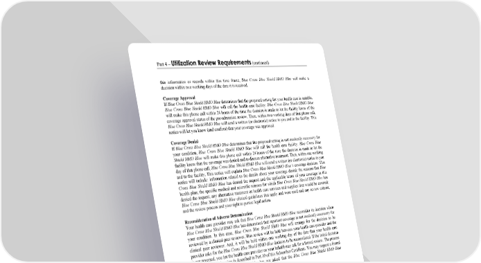 Part 4 – Utilization Review Requirements (continued) WORDS IN ITALICS ARE EXPLAINED IN PART 2. Page 30 this information or records within this time frame, Blue Cross Blue Shield HMO Blue will make a decision within two working days of the date it is received. Coverage Approval If Blue Cross Blue Shield HMO Blue determines that the proposed setting for your health care is suitable, Blue Cross Blue Shield HMO Blue will call the health care facility. Blue Cross Blue Shield HMO Blue will make this phone call within 24 hours of the time the decision is made to let the facility know of the coverage approval status of the pre-admission review. Then, within two working days of that phone call, Blue Cross Blue Shield HMO Blue will send a written (or electronic) notice to you and to the facility. This notice will let you know (and confirm) that your coverage was approved. Coverage Denial If Blue Cross Blue Shield HMO Blue determines that the proposed setting is not medically necessary for your condition, Blue Cross Blue Shield HMO Blue will call the health care facility. Blue Cross Blue Shield HMO Blue will make this phone call within 24 hours of the time the decision is made to let the facility know that the coverage was denied and to discuss alternative treatment. Then, within one working day of that phone call, Blue Cross Blue Shield HMO Blue will send a written (or electronic) notice to you and to the facility. This notice will explain Blue Cross Blue Shield HMO Blue’s coverage decision. This notice will include: information related to the details about your coverage denial; the reasons that Blue Cross Blue Shield HMO Blue has denied the request and the applicable terms of your coverage in this health plan; the specific medical and scientific reasons for which Blue Cross Blue Shield HMO Blue has denied the request; any alternative treatment or health care services and supplies that would be covered; Blue Cross Blue Shield HMO Blue clinical guidelines that apply and were used and any review criteria; and the review process and your right to pursue legal action. Reconsideration of Adverse Determination Your health care provider may ask that Blue Cross Blue Shield HMO Blue reconsider its decision when Blue Cross Blue Shield HMO Blue has determined that inpatient coverage is not medically necessary for your condition. In this case, Blue Cross Blue Shield HMO Blue will arrange for the decision to be reviewed by a clinical peer reviewer. This review will be held between your health care provider and the clinical peer reviewer. And, it will be held within one working day of the date that your health care provider asks for the Blue Cross Blue Shield HMO Blue decision to be reconsidered. If the initial decision is not reversed, you (or the health care provider on your behalf) may ask for a formal review. The process to ask for a formal review is described in Part 10 of this Subscriber Certificate. You may request a formal review even if your health care provider has not asked that the Blue Cross Blue Shield HMO Blue decision be reconsidered. Concurrent Review and Discharge Planning Concurrent Review means that while you are an inpatient, Blue Cross Blue Shield HMO Blue will monitor and review the health care services you receive to make sure you still need inpatient coverage in that facility. In some cases, Blue Cross Blue Shield HMO Blue may determine upon review that you will need to continue inpatient coverage in that health care facility beyond the number of days first thought to be required for your condition. When Blue Cross Blue Shield HMO Blue makes this decision (within one working day of receiving all necessary information), Blue Cross Blue Shield HMO Blue will let the health care facility know of the coverage approval status of the review. Blue Cross Blue Shield HMO Blue will do this within one working day of making this decision. Blue Cross Blue Shield HMO Blue will also send a written (or electronic) notice to you and to the facility to explain the decision. This notice will be sent within one working day of that first notice. This notice will include: the number of additional days that are being approved for coverage (or the next review date); the new total number of approved days or services; and the date the approved services will begin.