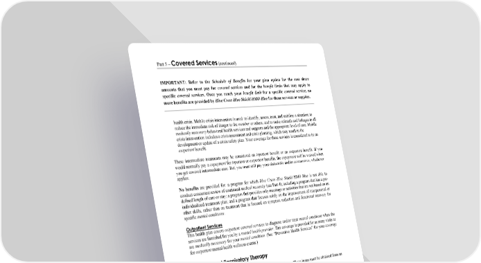Part 5 – Covered Services (continued) IMPORTANT: Refer to the Schedule of Benefits for your plan option for the cost share amounts that you must pay for covered services and for the benefit limits that may apply to specific covered services. Once you reach your benefit limit for a specific covered service, no more benefits are provided by Blue Cross Blue Shield HMO Blue for those services or supplies. WORDS IN ITALICS ARE EXPLAINED IN PART 2. Page 53 health crisis. Mobile crisis intervention is used: to identify, assess, treat, and stabilize a situation; to reduce the immediate risk of danger to the member or others; and to make referrals and linkages to all medically necessary behavioral health services and supports and the appropriate level of care. Mobile crisis intervention includes a crisis assessment and crisis planning, which may result in the development or update of a crisis safety plan. Your coverage for these services is considered to be an outpatient benefit. These intermediate treatments may be considered an inpatient benefit or an outpatient benefit. If you would normally pay a copayment for inpatient or outpatient benefits, the copayment will be waived when you get covered intermediate care. But, you must still pay your deductible and/or coinsurance, whichever applies. No benefits are provided for: a program for which Blue Cross Blue Shield HMO Blue is not able to conduct concurrent review of continued medical necessity (see Part 4), including a program that has a pre- defined length of care or stay; a program that provides only meetings or activities that are not based on an individualized treatment plan; and a program that focuses solely on the improvement of interpersonal or other skills, rather than on treatment that is focused on symptom reduction and functional recovery for specific mental conditions. Outpatient Services This health plan covers outpatient covered services to diagnose and/or treat mental conditions when the services are furnished for you by a mental health provider. This coverage is provided for as many visits as are medically necessary for your mental condition. (See “Preventive Health Services” for your coverage for outpatient mental health wellness exams.) Oxygen and Respiratory Therapy This health plan covers:  Oxygen and the equipment to administer it for use in the home. These items must be obtained from an oxygen supplier. This includes oxygen concentrators.  Respiratory therapy services. These services must be furnished for you by a covered provider. Some examples are: postural drainage; and chest percussion. Pain Management Alternatives to Opiates There are certain health care services or supplies that are covered by this health plan that are considered to be alternative treatments to opiates for pain management, when these covered services are furnished by a covered provider. Some examples of covered services include (but are not limited to):  Acupuncture services (see “Medical Care Outpatient Visits”).  Chiropractic services (see “Chiropractor Services”).  Devices such as transcutaneous electrical nerve stimulation (TENS) units and their related supplies (see “Durable Medical Equipment” for your coverage for durable medical equipment or covered supplies).