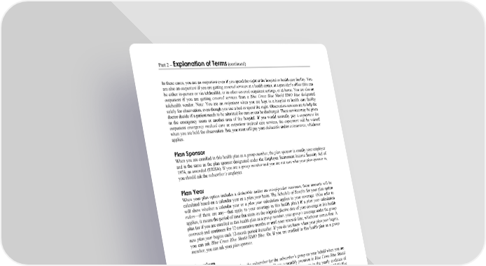 Part 2 – Explanation of Terms (continued) WORDS IN ITALICS ARE EXPLAINED IN PART 2. Page 21 In these cases, you are an outpatient even if you spend the night at the hospital or health care facility. You are also an outpatient if you are getting covered services at a health center, at a provider’s office (this can be either in-person or via telehealth), or in other covered outpatient settings, or at home. You are also an outpatient if you are getting covered services from a Blue Cross Blue Shield HMO Blue designated telehealth vendor. Note: You are an outpatient when you are kept in a hospital or health care facility solely for observation, even though you use a bed or spend the night. Observation services are to help the doctor decide if a patient needs to be admitted for care or can be discharged. These services may be given in the emergency room or another area of the hospital. If you would normally pay a copayment for outpatient emergency medical care or outpatient medical care services, the copayment will be waived when you are held for observation. But, you must still pay your deductible and/or coinsurance, whichever applies. Plan Sponsor When you are enrolled in this health plan as a group member, the plan sponsor is usually your employer and is the same as the plan sponsor designated under the Employee Retirement Income Security Act of 1974, as amended (ERISA). If you are a group member and you are not sure who your plan sponsor is, you should ask the subscriber’s employer. Plan Year When your plan option includes a deductible and/or an out-of-pocket maximum, these amounts will be calculated based on a calendar year or a plan year basis. The Schedule of Benefits for your plan option will show whether a calendar year or a plan year calculation applies to your coverage. (Also refer to riders—if there are any—that apply to your coverage in this health plan.) If a plan year calculation applies, it means the period of time that starts on the original effective date of your coverage in this health plan (or if you are enrolled in this health plan as a group member, your group’s coverage under the group contract) and continues for 12 consecutive months or until your renewal date, whichever comes first. A new plan year begins each 12-month period thereafter. If you do not know when your plan year begins, you can ask Blue Cross Blue Shield HMO Blue. Or, if you are enrolled in this health plan as a group member, you can ask your plan sponsor. Premium For coverage in this health plan, the subscriber (or the subscriber’s group on your behalf when you are enrolled in this health plan as a group member) will pay a monthly premium to Blue Cross Blue Shield HMO Blue. The total amount of your monthly premium is provided to you in the yearly evidence of coverage packet that is issued by Blue Cross Blue Shield HMO Blue. Blue Cross Blue Shield HMO Blue will provide you with access to health care services and benefits as long as the total premium that is owed for your coverage in this health plan is paid to Blue Cross Blue Shield HMO Blue. Blue Cross Blue Shield HMO Blue may change your premium. Each time Blue Cross Blue Shield HMO Blue changes the premium for coverage in this health plan, Blue Cross Blue Shield HMO Blue will notify you (or the subscriber’s group when you are enrolled in this health plan as a group member) before the change takes place. (If you enrolled in this health plan through the Massachusetts Health Connector, see Part 11 or Part 12, whichever applies to you, for information.)