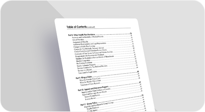 Table of Contents (continued) iv Part 8 Other Health Plan Provisions........................................................................................78 Access to and Confidentiality of Medical Records..............................................................................78 Acts of Providers..................................................................................................................................78 Assignment of Benefits........................................................................................................................79 Authorized Representative and Legal Representative .........................................................................79 Changes to Health Plan Coverage........................................................................................................79 Charges for Non-Medically Necessary Services .................................................................................80 Clinical Guidelines and Utilization Review Criteria ...........................................................................80 Continuity of Care Access for Cancer and Pediatric Facilities............................................................81 Disagreement with Recommended Treatment.....................................................................................81 Mandates for Residents or Services Outside of Massachusetts ...........................................................82 Member Cooperation ...........................................................................................................................82 Pre-Existing Conditions.......................................................................................................................82 Quality Assurance Programs................................................................................................................82 Services Furnished by Non-Preferred Providers..................................................................................83 Services in a Disaster...........................................................................................................................84 Time Limit for Legal Action................................................................................................................84 Part 9 Filing a Claim ................................................................................................................85 When the Provider Files a Claim .........................................................................................................85 When the Member Files a Claim .........................................................................................................85 Timeliness of Claim Payments ............................................................................................................86 Part 10 Appeal and Grievance Program...............................................................................87 Inquiries and/or Claim Problems or Concerns.....................................................................................87 Appeal and Grievance Review Process ...............................................................................................87 Internal Formal Review ..................................................................................................................87 External Review..............................................................................................................................91 Part 11 Group Policy................................................................................................................94 Eligibility and Enrollment for Group Coverage ..................................................................................94 Eligible Employee...........................................................................................................................94 Eligible Spouse ...............................................................................................................................94 Eligible Dependents........................................................................................................................95 Enrollment Periods for Group Coverage .............................................................................................96 Initial Enrollment............................................................................................................................96 Special Enrollment..........................................................................................................................96 Qualified Medical Child Support Order .........................................................................................98 Open Enrollment Period .................................................................................................................98 Other Membership Changes ...........................................................................................................98 Termination of Group Coverage..........................................................................................................98 Loss of Eligibility for Group Coverage..........................................................................................98 Termination of Group Coverage by the Subscriber........................................................................99 Termination of Group Coverage by Blue Cross Blue Shield HMO Blue ......................................99 Continuation of Group Coverage.......................................................................................................100 Family and Medical Leave Act.....................................................................................................100 Limited Extension of Group Coverage under State Law..............................................................100 Continuation of Group Coverage under Fed