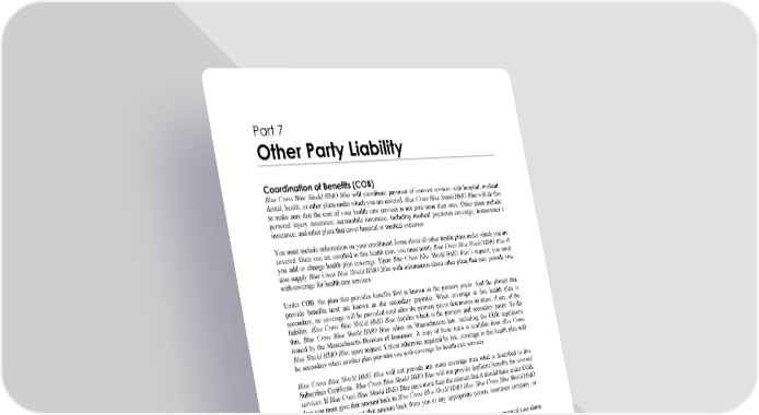 WORDS IN ITALICS ARE EXPLAINED IN PART 2. Page 76 Part 7 Other Party Liability Coordination of Benefits (COB) Blue Cross Blue Shield HMO Blue will coordinate payment of covered services with hospital, medical, dental, health, or other plans under which you are covered. Blue Cross Blue Shield HMO Blue will do this to make sure that the cost of your health care services is not paid more than once. Other plans include: personal injury insurance; automobile insurance, including medical payments coverage; homeowner’s insurance; and other plans that cover hospital or medical expenses. You must include information on your enrollment forms about all other health plans under which you are covered. Once you are enrolled in this health plan, you must notify Blue Cross Blue Shield HMO Blue if you add or change health plan coverage. Upon Blue Cross Blue Shield HMO Blue’s request, you must also supply Blue Cross Blue Shield HMO Blue with information about other plans that may provide you with coverage for health care services. Under COB, the plan that provides benefits first is known as the primary payor. And the plan(s) that provide benefits next are known as the secondary payor(s). When coverage in this health plan is secondary, no coverage will be provided until after the primary payor determines its share, if any, of the liability. Blue Cross Blue Shield HMO Blue decides which is the primary and secondary payor. To do this, Blue Cross Blue Shield HMO Blue relies on Massachusetts law, including the COB regulations issued by the Massachusetts Division of Insurance. A copy of these rules is available from Blue Cross Blue Shield HMO Blue upon request. Unless otherwise required by law, coverage in this health plan will be secondary when another plan provides you with coverage for health care services. Blue Cross Blue Shield HMO Blue will not provide any more coverage than what is described in this Subscriber Certificate. Blue Cross Blue Shield HMO Blue will not provide duplicate benefits for covered services. If Blue Cross Blue Shield HMO Blue pays more than the amount that it should have under COB, then you must give that amount back to Blue Cross Blue Shield HMO Blue. Blue Cross Blue Shield HMO Blue has the right to get that amount back from you or any appropriate person, insurance company, or other organization. Important Notice: If you fail to comply with the provisions of this COB section, payment of your claim may be denied. Blue Cross Blue Shield HMO Blue’s Rights to Recover Benefit Payments Subrogation and Reimbursement of Benefit Payments If you are injured by any act or omission of another person, the benefits under this health plan will be subrogated. This means that Blue Cross Blue Shield HMO Blue may use your right to recover money from the person(s) who caused the injury or from any insurance company or other party. If you recover money, Blue Cross Blue Shield HMO Blue is entitled to recover up to the amount of the benefit payments that it has made. This is true no matter where or by whom the recovered money is held or how it is designated and even if you do not recover the total amount of your claim against the other person(s). This is also true if the payment you receive is described as payment for other than health care expenses. The amount that you must reimburse to Blue Cross Blue Shield HMO Blue will not be reduced by any attorney’s fees or expenses that you incur.