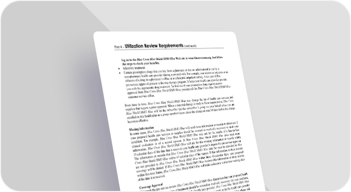 Part 4 – Utilization Review Requirements (continued) WORDS IN ITALICS ARE EXPLAINED IN PART 2. Page 28 log on to the Blue Cross Blue Shield HMO Blue Web site at www.bluecrossma.org. Just follow the steps to check your benefits. Infertility treatment. Certain prescription drugs that you buy from a pharmacy or that are administered to you by a non-pharmacy health care provider during a covered visit. For example, you receive an injection or an infusion of a drug in a physician’s office or in a hospital outpatient setting. A key part of this pre-service approval process is the step therapy program. It helps your health care provider provide you with the appropriate drug treatment. To find out if your prescription drug requires a prior approval from Blue Cross Blue Shield HMO Blue, you can call the Blue Cross Blue Shield HMO Blue customer service office. From time to time, Blue Cross Blue Shield HMO Blue may change the list of health care services and supplies that require a prior approval. When a material change is made to these requirements, Blue Cross Blue Shield HMO Blue will let the subscriber (or the subscriber’s group on your behalf when you are enrolled in this health plan as a group member) know about the change at least 60 days before the change becomes effective. Missing Information In some cases, Blue Cross Blue Shield HMO Blue will need more information or records to determine if your proposed health care services or supplies should be covered as medically necessary to treat your condition. For example, Blue Cross Blue Shield HMO Blue may ask for the results of a face-to-face clinical evaluation or of a second opinion. If Blue Cross Blue Shield HMO Blue does need more information, Blue Cross Blue Shield HMO Blue will ask for this missing information or records within 15 calendar days of the date that it received your health care provider’s request for pre-service approval. The information or records that Blue Cross Blue Shield HMO Blue asks for must be provided to Blue Cross Blue Shield HMO Blue within 45 calendar days of the request. If this information or these records are not provided to Blue Cross Blue Shield HMO Blue within these 45 calendar days, your proposed coverage will be denied. If Blue Cross Blue Shield HMO Blue receives this information or these records within this time frame, Blue Cross Blue Shield HMO Blue will make a decision within two working days of the date it is received. Coverage Approval If through the pre-service review Blue Cross Blue Shield HMO Blue determines that your proposed health care service, supply, or course of treatment should be covered as medically necessary for your condition, Blue Cross Blue Shield HMO Blue will call the health care provider. Blue Cross Blue Shield HMO Blue will make this phone call within 24 hours of the time the decision is made to let the health care provider know of the coverage approval status of the review. Then, within two working days of that phone call, Blue Cross Blue Shield HMO Blue will send a written (or electronic) notice to you and to the health care provider. This notice will let you know (and confirm) that your coverage was approved. Coverage Denial If through the pre-service review Blue Cross Blue Shield HMO Blue determines that your proposed health care service, supply, or course of treatment should not be covered as medically necessary for your condition, Blue Cross Blue Shield HMO Blue will call the health care provider. Blue Cross Blue Shield HMO Blue will make this phone call within 24 hours of the time the decision is made to let the health care provider know that the coverage was denied and to discuss alternative treatment. Then, within one working day of that phone call, Blue Cross Blue Shield HMO Blue will send a written (or electronic) notice to you and to the health care provider. This notice will explain Blue Cross Blue Shield HMO Blue’s coverage decision. This notice will include: information related to the details about your coverage denial; the reasons that Blue Cross Blue Shield HMO Blue has denied the request and the applicable terms of