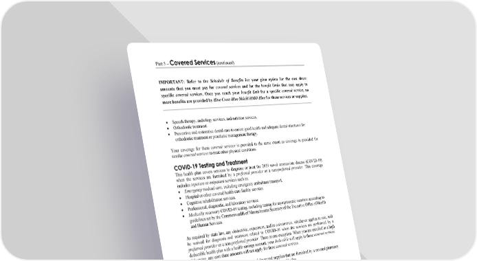 Part 5 – Covered Services (continued) IMPORTANT: Refer to the Schedule of Benefits for your plan option for the cost share amounts that you must pay for covered services and for the benefit limits that may apply to specific covered services. Once you reach your benefit limit for a specific covered service, no more benefits are provided by Blue Cross Blue Shield HMO Blue for those services or supplies. WORDS IN ITALICS ARE EXPLAINED IN PART 2. Page 39 Speech therapy, audiology services, and nutrition services. Orthodontic treatment. Preventive and restorative dental care to ensure good health and adequate dental structures for orthodontic treatment or prosthetic management therapy. Your coverage for these covered services is provided to the same extent as coverage is provided for similar covered services to treat other physical conditions. COVID-19 Testing and Treatment This health plan covers services to diagnose or treat the 2019 novel coronavirus disease (COVID-19) when the services are furnished by a preferred provider or a non-preferred provider. This coverage includes inpatient or outpatient services such as: Emergency medical care, including emergency ambulance transport. Hospital or other covered health care facility services. Cognitive rehabilitation services. Professional, diagnostic, and laboratory services. Medically necessary COVID-19 testing, including testing for asymptomatic members according to guidelines set by the Commonwealth of Massachusetts Secretary of the Executive Office of Health and Human Services. As required by state law, any deductible, copayment, and/or coinsurance, whichever applies to you, will be waived for diagnosis and treatment related to COVID-19 when the services are performed by a preferred provider or a non-preferred provider. There is one exception. When you are enrolled in a high deductible health plan with a health savings account, your deductible will apply to these covered services. Otherwise, any cost share amounts will not apply for these covered services. These covered services also include covered drugs and supplies that are furnished by a covered pharmacy when your prescription drug coverage is provided under this health plan. If a benefit limit would normally apply to any of the covered services listed above, a benefit limit will not apply for covered services to diagnose or treat COVID-19. Dialysis Services This health plan covers outpatient dialysis when it is furnished for you by a hospital; or by a community health center; or by a free-standing dialysis facility; or by a physician. This coverage also includes home dialysis when it is furnished under the direction of a covered provider. Your home dialysis coverage includes: non-durable medical supplies (such as dialysis membrane and solution, tubing, and drugs that are needed during dialysis); the cost to install the dialysis equipment in your home; and the cost to maintain or to fix the dialysis equipment. No home dialysis benefits are provided for: costs to get or supply power, water, or waste disposal systems; costs of a person to help with the dialysis procedure; and costs that are not needed to run the dialysis equipment.