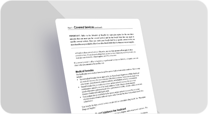 Part 5 – Covered Services (continued) IMPORTANT: Refer to the Schedule of Benefits for your plan option for the cost share amounts that you must pay for covered services and for the benefit limits that may apply to specific covered services. Once you reach your benefit limit for a specific covered service, no more benefits are provided by Blue Cross Blue Shield HMO Blue for those services or supplies. WORDS IN ITALICS ARE EXPLAINED IN PART 2. Page 49 will apply to these covered services. Otherwise, any cost share amounts will not apply for these covered services. If you choose to obtain these covered services from a non-preferred provider, you must pay your deductible, when it applies, and 20% coinsurance. If a covered provider’s office is located at, or professional services are billed by, a hospital, your cost share is the same amount as for an office visit. Medical Formulas This health plan covers medical formulas and low protein foods to treat certain conditions. This coverage includes: Special medical formulas that are approved by the Massachusetts Department of Public Health and are medically necessary for you to treat one of the listed conditions: homocystinuria; maple syrup urine disease; phenylketonuria; propionic acidemia; methylmalonic acidemia; or tyrosinemia. Enteral formulas that you need to use at home and are medically necessary for you to treat malabsorption caused by one of the listed conditions: Crohn’s disease; chronic intestinal pseudo-obstruction; gastroesophageal reflux; gastrointestinal motility; ulcerative colitis; or inherited diseases of amino acids and organic acids. Food products that are modified to be low protein and are medically necessary for you to treat inherited diseases of amino acids and organic acids. (You may buy these food products directly from a distributor.) Your benefits for these covered services are provided as a prescription drug benefit. See “Prescription Drugs and Supplies.” Mental Health and Substance Use Treatment This health plan covers medically necessary services to diagnose and/or treat mental conditions. This coverage includes: Biologically-based mental conditions. “Biologically-based mental conditions” means: schizophrenia; schizoaffective disorder; major depressive disorder; bipolar disorder; paranoia and other psychotic disorders; obsessive-compulsive disorder; panic disorder; delirium and dementia; affective disorders; eating disorders; post-traumatic stress disorders; autism; substance use disorders (such as drug and alcohol addiction); and any biologically-based mental conditions that appear in the most recent edition of the American Psychiatric Association’s Diagnostic and Statistical Manual of Mental Disorders that are scientifically recognized and approved by the Commissioner of the Department of Mental Health. Rape-related mental or emotional disorders for victims of a rape or victims of an assault with intent to rape. Non-biologically-based mental, behavior, or emotional disorders of enrolled dependent children who are under age 19. This coverage includes pediatric specialty mental health care that is furnished by a mental health provider who has a recognized expertise in specialty pediatrics. (This coverage is not limited to those disorders that substantially interfere with or limit the way the child functions or how