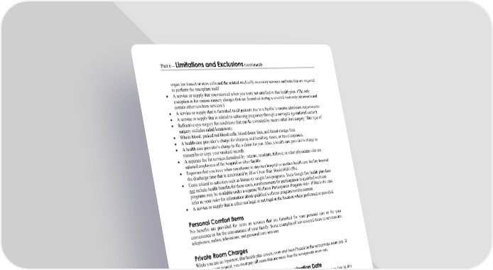 Part 6 – Limitations and Exclusions (continued) WORDS IN ITALICS ARE EXPLAINED IN PART 2. Page 74 organ (or tissue) or stem cells and the related medically necessary services and tests that are required to perform the transplant itself. A service or supply that you received when you were not enrolled in this health plan. (The only exception is for routine nursery charges that are furnished during a covered maternity admission and certain other newborn services.) A service or supply that is furnished to all patients due to a facility’s routine admission requirements. A service or supply that is related to achieving pregnancy through a surrogate (gestational carrier). Refractive eye surgery for conditions that can be corrected by means other than surgery. This type of surgery includes radial keratotomy. Whole blood; packed red blood cells; blood donor fees; and blood storage fees. A health care provider’s charge for shipping and handling, taxes, or travel expenses. A health care provider’s charge to file a claim for you. Also, a health care provider’s charge to transcribe or copy your medical records. A separate fee for services furnished by: interns; residents; fellows; or other physicians who are salaried employees of the hospital or other facility. Expenses that you have when you choose to stay in a hospital or another health care facility beyond the discharge time that is determined by Blue Cross Blue Shield HMO Blue. Costs related to activities such as fitness or weight loss programs. Even though this health plan does not include health benefits for these costs, reimbursement for participation in qualified wellness programs may be available under a separate Wellness Participation Program rider. If this is the case, refer to your rider for information about qualified wellness program reimbursement. A service or supply that is either not legal or not legal in the location where performed or provided. Personal Comfort Items No benefits are provided for items or services that are furnished for your personal care or for your convenience or for the convenience of your family. Some examples of non-covered items or services are: telephones; radios; televisions; and personal care services. Private Room Charges While you are an inpatient, this health plan covers room and board based on the semiprivate room rate. If a private room is used, you must pay all costs that are more than the semiprivate room rate. Services and Supplies Furnished After Termination Date No benefits are provided for services and supplies that are furnished after your termination date in this health plan unless otherwise required by law. Exception for inpatient admissions prior to January 1, 2025: For inpatient admissions that begin prior to January 1, 2025, this health plan will continue to provide coverage for inpatient covered services, but only if you are receiving covered inpatient care on your termination date. In this case, coverage will continue to be provided until all the benefits allowed by your health plan have been used up or the date of discharge, whichever comes first. But, this exception does not apply if your coverage in this health plan is canceled for misrepresentation or fraud.