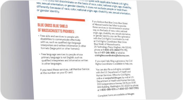 Blue Cross Blue Shield of Massachusetts is an Independent Licensee of the Blue Cross and Blue Shield Association. Registered Marks of the Blue Cross and Blue Shield Association. 2024 Blue Cross and Blue Shield of Massachusetts, Inc., or Blue Cross and Blue Shield of Massachusetts HMO Blue, Inc. 2915351 55-1487 (5/24) Blue Cross Blue Shield of Massachusetts complies with applicable federal civil rights laws and does not discriminate on the basis of race, color, national origin, age, disability, sex, sexual orientation, or gender identity. It does not exclude people or treat them differently because of race, color, national origin, age, disability, sex, sexual orientation, or gender identity. Blue Cross Blue Shield of Massachusetts provides: Free aids and services to people with disabilities to communicate effectively with us, such as qualified sign language interpreters and written information in other formats (large print or other formats). Free language services to people whose primary language is not English, such as qualified interpreters and information written in other languages. If you need these services, call Member Service at the number on your ID card. NONDISCRIMINATION NOTICE If you believe that Blue Cross Blue Shield of Massachusetts has failed to provide these services or discriminated in another way on the basis of race, color, national origin, age, disability, sex, sexual orientation, or gender identity, you can file a grievance with the Civil Rights Coordinator by mail at Civil Rights Coordinator, Blue Cross Blue Shield of Massachusetts, 25 Technology Place, Hingham, MA 02043; phone at 1-800-472-2689 (TTY: 711) ; fax at 1-617-246-3616 ; or email at [email protected] . If you need help filing a grievance, the Civil Rights Coordinator is available to help you. You can also file a civil rights complaint with the U.S. Department of Health and Human Services, Office for Civil Rights, online at ocrportal.hhs.gov ; by mail at U.S. Department of Health and Human Services, 200 Independence Avenue, SW Room 509F, HHH Building, Washington, DC 20201; by phone at 1-800-368-1019 or 1-800-537-7697 (TDD) . Complaint forms are available at hhs.gov .