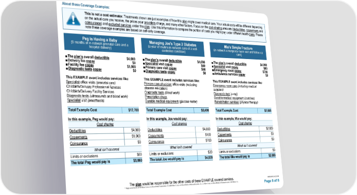 About these Coverage Examples: This is not a cost estimator. Treatments shown are just examples of how this plan might cover medical care. Your actual costs will be different depending on the actual care you receive, the prices your providers charge, and many other factors. Focus on the cost-sharing amounts (deductibles, copayments and coinsurance) and excluded services under the plan. Use this information to compare the portion of costs you might pay under different health plans. Please note these coverage examples are based on self-only coverage. Peg is Having a Baby (9 months of in-network prenatal care and a hospital delivery) ■The plan’s overall deductible $4,000 ■Delivery fee copay $0 ■Facility fee copay $1,000 ■Diagnostic tests copay $0 This EXAMPLE event includes services like: Specialist office visits (prenatal care) Childbirth/Delivery Professional Services Childbirth/Delivery Facility Services Diagnostic tests (ultrasounds and blood work) Specialist visit (anesthesia) Total Example Cost $12,700 In this example, Peg would pay: Cost sharing Deductibles $4,000 Copayments $1,000 Coinsurance $0 What isn’t covered Limits or exclusions $60 The total Peg would pay is $5,060 Managing Joe's Type 2 Diabetes (a year of routine in-network care of a well- controlled condition) ■The plan’s overall deductible $4,000 ■Specialist visit copay $60 ■Primary care visit copay $60 ■Diagnostic tests copay $0 This EXAMPLE event includes services like: Primary care physician office visits (including disease education) Diagnostic tests (blood work) Prescription drugs Durable medical equipment (glucose meter) Total Example Cost $5,600 In this example, Joe would pay: Cost sharing Deductibles $4,000 Copayments $100 Coinsurance $700 What isn’t covered Limits or exclusions $20 The total Joe would pay is $4,820 Mia’s Simple Fracture (in-network emergency room visit and follow-up care) ■The plan’s overall deductible $4,000 ■Specialist visit copay $60 ■Emergency room copay $750 ■Ambulance services copay $0 This EXAMPLE event includes services like: Emergency room care (including medical supplies) Diagnostic test (x-ray) Durable medical equipment (crutches) Rehabilitation services (physical therapy) Total Example Cost $2,800 In this example, Mia would pay: Cost sharing Deductibles $2,800 Copayments $0 Coinsurance $0 What isn’t covered Limits or exclusions $0 The total Mia would pay is $2,800 The plan would be responsible for the other costs of these EXAMPLE covered services. 003558709 (4/25) RB ® Registered Marks of the Blue Cross and Blue Shield Association. © 2025 Blue Cross and Blue Shield of Massachusetts, Inc., or Blue Cross and Blue Shield of Massachusetts HMO Blue, Inc. Page 8 of 8