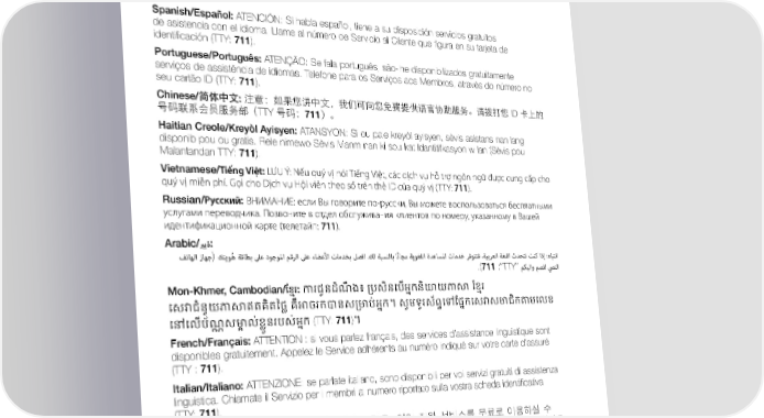 TRANSLATION RESOURCES Proficiency of Language Assistance Services Translation Resources Proficiency of Language Assistance Services Spanish/Español: ATENCIÓN: Si habla español, tiene a su disposición servicios gratuitos de asistencia con el idioma. Llame al número de Servicio al Cliente que figura en su tarjeta de identificación (TTY: 711). Portuguese/Português: ATENÇÃO: Se fala português, são-lhe disponibilizados gratuitamente serviços de assistência de idiomas. Telefone para os Serviços aos Membros, através do número no seu cartão ID (TTY: 711). Chinese/简体中文: 注意:如果您讲中文,我们可向您免费提供语言协助服务。请拨打您 ID 卡上的 号码联系会员服务部(TTY 号码:711)。 Haitian Creole/Kreyòl Ayisyen: ATANSYON: Si ou pale kreyòl ayisyen, sèvis asistans nan lang disponib pou ou gratis. Rele nimewo Sèvis Manm nan ki sou kat Idantitifkasyon w lan (Sèvis pou Malantandan TTY: 711). Vietnamese/Tiếng Việt: LƯU Ý: Nếu quý vị nói Tiếng Việt, các dịch vụ hỗ trợ ngôn ngữ được cung cấp cho quý vị miễn phí. Gọi cho Dịch vụ Hội viên theo số trên thẻ ID của quý vị (TTY: 711). Russian/Русский: ВНИМАНИЕ: если Вы говорите по-русски, Вы можете воспользоваться бесплатными услугами переводчика. Позвоните в отдел обслуживания клиентов по номеру, указанному в Вашей идентификационной карте (телетайп: 711). Arabic/برية: فتاهلا زاهج) كتيوُه ةقاطب لىع دوجولما مقرلا لىع ءاضعلأا تامدخب لصتا .كل ةبسنلاب اًناجم ةيوغللا ةدعاسلما تامدخ رفوتتف ،ةيبرعلا ةغللا ثدحتت تنك اذإ :هابتنا .(711 :”TTY“ مكبلاو مصلل صينلا Mon-Khmer, Cambodian/ខ្មែរ: ការជូនដំណឹ ង៖ ប្រសិនប្រើអ្នកនិយាយភាសា ខ្មែរ បសវាជំនួយភាសាឥតគិតថ្លៃ គឺអាចរកបានសបរា្រ់អ្នក។ សូមទូរស័ព្ទបៅខ្្នកបសវាសរាជិកតាមបេ្ បៅបេើ្រ័ណ្ណ សរាគា េ់្លៃួនរ្រស់អ្នក (TTY: 711)។ French/Français: ATTENTION : si vous parlez français, des services d’assistance linguistique sont disponibles gratuitement. Appelez le Service adhérents au numéro indiqué sur votre carte d’assuré (TTY : 711). Italian/Italiano: ATTENZIONE: se parlate italiano, sono disponibili per voi servizi gratuiti di assistenza linguistica. Chiamate il Servizio per i membri al numero riportato sulla vostra scheda identificativa (TTY: 711). Korean/한국어: 주의: 한국어를 사용하시는 경우, 언어 지원 서비스를 무료로 이용하실 수 있습니다. 귀하의 ID 카드에 있는 전화번호(TTY: 711)를 사용하여 회원 서비스에 전화하십시오. Greek/λληνικά: ΠΡΟΣΟΧΗ: Εάν μιλάτε Ελληνικά, διατίθενται για σας υπηρεσίες γλωσσικής βοήθειας, δωρεάν. Καλέστε την Υπηρεσία Εξυπηρέτησης Μελών στον αριθμό της κάρτας μέλους σας (ID Card) (TTY: 711). Blue Cross Blue Shield of Massachusetts is an Independent Licensee of the Blue Cross and Blue Shield Association Blue Cross Blue Shield of Massachusetts is an Independent Licensee of the Blue Cross and Blue Shield Association. Greek/Eλληνικά: ΠΡΟΣΟΧΗ: Εάν μιλάτε Ελληνικά, διατίθενται για σας υπηρεσίες γλωσσικής βοήθειας, δωρεάν. Καλέστε την Υπηρεσία Εξυπηρέτησης Μελών στον αριθμό της κάρτας μέλους σας (ID Card) (TTY: 711).