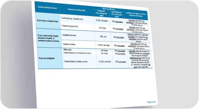 Page 4 of 8 Common Medical Event Services You May Need What You Will Pay Limitations, Exceptions, & Other Important Information In-Network (You will pay the least) Out-of-Network (You will pay the most) If you have a hospital stay Facility fee (e.g., hospital room) $1,000 / admission 20% coinsurance Deductible applies first; pre- authorization / authorization required for certain services Physician/surgeon fees No charge 20% coinsurance Deductible applies first; pre- authorization / authorization required for certain services If you need mental health, behavioral health, or substance abuse services Outpatient services $60 / visit 20% coinsurance Deductible applies first; a telehealth cost share may be applicable; pre- authorization required for certain services Inpatient services $1,000 / admission 20% coinsurance Deductible applies first; pre- authorization / authorization required for certain services If you are pregnant Office visits No charge 20% coinsurance Deductible applies first except for in- network prenatal care; cost sharing does not apply for in-network preventive services; maternity care may include tests and services described elsewhere in the SBC (i.e. ultrasound); a telehealth cost share may be applicable Childbirth/delivery professional services No charge 20% coinsurance Childbirth/delivery facility services $1,000 / admission 20% coinsurance