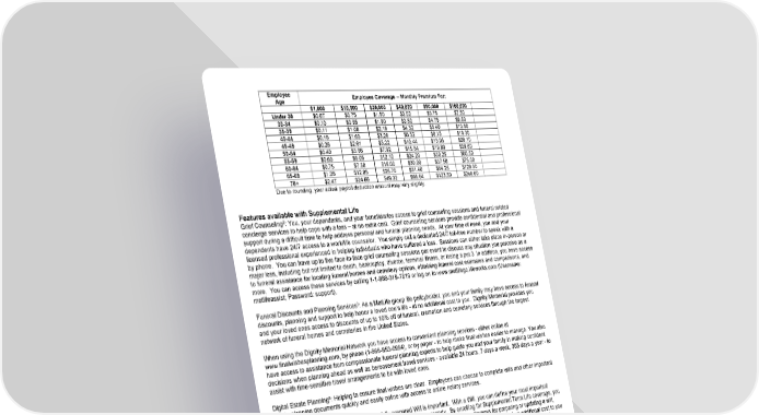 Employee Employee Coverage -- Monthly Premium For: Age $1,000 $10,000 $20,000 $40,000 $50,000 $100,000 Under 30 $0.07 $0.75 $1.50 $3.00 $3.75 $7.50 30-34 $0.10 $0.95 $1.90 $3.80 $4.75 $9.50 35-39 $0.11 $1.08 $2.16 $4.32 $5.40 $10.80 40-44 $0.16 $1.63 $3.26 $6.52 $8.15 $16.30 45-49 $0.26 $2.61 $5.22 $10.44 $13.05 $26.10 50-54 $0.40 $3.96 $7.92 $15.84 $19.80 $39.60 55-59 $0.60 $6.05 $12.10 $24.20 $30.25 $60.50 60-64 $0.75 $7.50 $15.00 $30.00 $37.50 $75.00 65-69 $1.28 $12.85 $25.70 $51.40 $64.25 $128.50 70+ $2.47 $24.66 $49.32 $98.64 $123.30 $246.60 Due to rounding, your actual payroll deduction amount may vary slightly. Features available with Supplemental Life 2 Grief Counseling : You, your dependents, and your beneficiaries access to grief counseling sessions and funeral related concierge services to help cope with a loss – at no extra cost. Grief counseling services provide confidential and professional support during a difficult time to help address personal and funeral planning needs. At your time of need, you and your dependents have 24/7 access to a work/life counselor. You simply call a dedicated 24/7 toll-free number to speak with a licensed professional experienced in helping individuals who have suffered a loss. Sessions can either take place in-person or by phone. You can have up to five face-to-face grief counseling sessions per event to discuss any situation you perceive as a major loss, including but not limited to death, bankruptcy, divorce, terminal illness, or losing a pet.3 In addition, you have access to funeral assistance for locating funeral homes and cemetery options, obtaining funeral cost estimates and comparisons, and more. You can access these services by calling 1-1-888-319-7819 or log on to www.metlifegc.lifeworks.com (Username: metlifeassist; Password: support). Funeral Discounts and Planning Services3: As a MetLife group life policyholder, you and your family may have access to funeral discounts, planning and support to help honor a loved one’s life - at no additional cost to you. Dignity Memorial provides you and your loved ones access to discounts of up to 10% off of funeral, cremation and cemetery services through the largest network of funeral homes and cemeteries in the United States. When using the Dignity Memorial Network you have access to convenient planning services - either online at www.finalwishesplanning.com, by phone (1-866-853-0954), or by paper - to help make final wishes easier to manage. You also have access to assistance from compassionate funeral planning experts to help guide you and your family in making confident decisions when planning ahead as well as bereavement travel services - available 24 hours, 7 days a week, 365 days a year - to assist with time-sensitive travel arrangements to be with loved ones. 6 Digital Estate Planning : Helping to ensure final wishes are clear. Employees can choose to complete wills and other important estate planning documents quickly and easily online with access to online notary services. 4 Will Preparation :Like life insurance, a carefully prepared Will is important. With a Will, you can define your most important decisions such as who will care for your children or inherit your property. By enrolling for Supplemental Term Life coverage, you will have in person access to MetLife Legal Plans' network of 18,000+ participating attorneys for preparing or updating a will, living will and power of attorney. When you enroll in this plan, you may take advantage of this benefit at no additional cost to you if you use a participating plan attorney. To obtain the legal plan's toll-free number and your company's group access number, contact your employer or your plan administrator for this information. MetLife Estate Resolution Services (ERS)4 :is a valuable service offered under the group policy. A MetLife Legal Plan attorney will consult with your beneficiaries by telephone or in person regarding the probate process for your estate. The attorney will also handle the probate of your estate for your executor or administrator.. This can help alleviate the financial and administrative burden upon your loved ones in their time of need. Portability5: If your present employment ends, you can choose to continue your current life benefits. What Is Not Covered? Like most insurance plans, this plan has exclusions. Supplemental Term Life Insurance do not provide payment of benefits for death caused by suicide within the first two years (one year in North Dakota) of the effective date of the certificate, or payment of increased benefits for death caused by suicide within two years (one year in North Dakota or Colorado) of an increase in coverage. In addition, a reduction schedule may apply. Please see your benefits administrator or certificate for specific details. 200 Park Ave., New York, NY 10166 © 2022 MetLife Services and Solutions, LLC LI-GCERT-SUPP-OVER EOL Benefit Summary L0322021157[exp0523][All States]