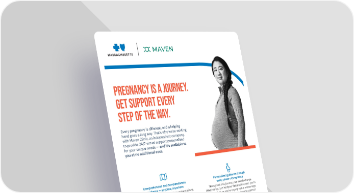 Here’s what you get with Maven • Unlimited video appointments and messaging with experts • Access to provider-led classes and pregnancy-related articles • A dedicated Care Advocate to help you make the most of Maven • The Maven app, with convenient access to the support you need Get started Sign up for Maven and get no-cost support today. Scan the QR code or go to mavenclinic.com/join/bcbsma Blue Cross Blue Shield of Massachusetts complies with applicable federal civil rights laws and does not discriminate on the basis of race, color, national origin, age, disability, sex, sexual orientation, or gender identity. ATTENTION: If you don’t speak English, language assistance services, free of charge, are available to you. Call Member Service at the number on your ID card (TTY: 711). ATENCIÓN: Si habla español, tiene a su disposición servicios gratuitos de asistencia con el idioma. Llame al número de Servicio al Cliente que figura en su tarjeta de identificación (TTY: 711). ATENÇÃO: Se fala português, são-lhe disponibilizados gratuitamente serviços de assistência de idiomas. Telefone para os Serviços aos Membros, através do número no seu cartão ID (TTY: 711). ® Registered Marks of the Blue Cross and Blue Shield Association. ®´ Registered Marks are the property of their respective owners. 002606864 (2/24) © 2024 Blue Cross and Blue Shield of Massachusetts, Inc., or Blue Cross and Blue Shield of Massachusetts HMO Blue, Inc.