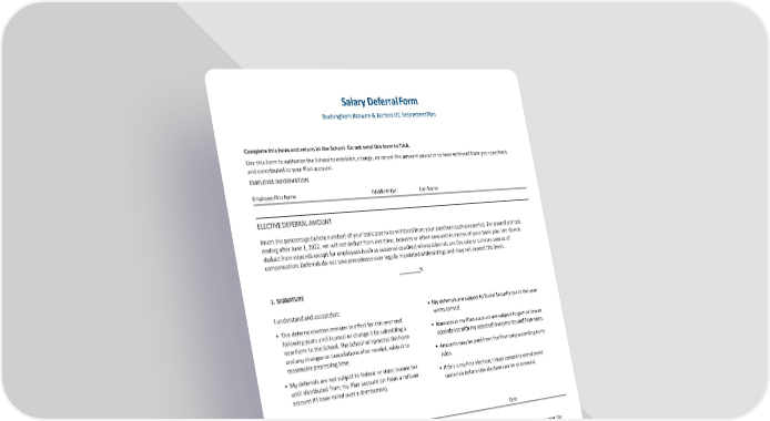 Salary DeferralForm Buckingham Browne & Nichols DC RetirementPlan Complete this form and return to the School. Do not send this form toTIAA. Use this form to authorize the School to establish, change, or cancel the amount you wish to have withheld from your paycheck and contributed to your Plan account. EMPLOYEEINFORMATION EmployeeFirstName MiddleInitial LastName ELECTIVE DEFERRALAMOUNT Insert the percentage (whole number) of your basic pay to be withheld from your paycheck each pay period. For payroll periods ending after June 1, 2022, we will not deduct from overtime, bonuses or other amounts in excess of your basic pay. We do not deduct from stipends except for employees (such as seasonal coaches) whose stipends are the sole or primary source of compensation. Deferrals do not take precedence over legally mandated withholdings and may not exceed IRS limits. % 1. SIGNATURE I understand and acceptthat: • MydeferralsaresubjecttoSocialSecuritytaxintheyear • This deferral election remains in effect for this year and when earned. following years until I cancel or change it by submitting a • AmountsinmyPlanaccountaresubjecttogainorlossin new Form to the School. The School will process thisForm accordancewithmyselectedinvestmentsandPlanrules. and any changes or cancellations after receipt, subject to • AmountsmaybepaidfromthePlanonlyaccordingtoits reasonable processingtime. rules. • Mydeferrals are not subject to federal or state income tax • Ifthisismyfirstelection,Imustcompleteenrollment until distributed from my Plan account (or from a rollover materials before this election can be processed. accountifIhaverolledovera distribution). EmployeeSignature Date IRS ANNUAL ELECTIVE DEFERRALLIMIT This chart shows the IRS annual Limits for deferrals and catch-up limits. You must be at least 50 years old in the calendar year for the catch-up limit to apply. These limits are reduced by any 403(b) or 401(k) salary deferrals you make in the same year to the plan of another employer. To avoid tax penalties, you must promptly notify the School if you have over-contributed so that the excess can be withdrawn. It is your responsibility to know and monitor the limit if you contribute to other plans in the same year as this Plan. Year Deferral Limit Catch-up Limit Total Deferral 2024 $23,000 $7,500 $30,500 2025 $23,500 Age 50+: $7,500 $31,000 Age 60-63: $11,250 $34,750