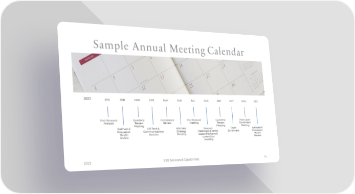 Sample Annual MeetingCalendar 2023 JAN FEB MAR APR MAY JUN JUL AUG SEP OCT NOV DEC Post-Renewal Quarterly Compliance Pre-Renewal Quarterly Post-Open Analysis Review Review Meeting Review Enrollment Meeting Meeting Meeting Wellness & HR Tech & Mid-Year Renewal Open Wellness & Population Communications Strategy Meeting(s) & senior Enrollment Population Health Reviews Meeting leadership/benefit Health Review committee Review meeting 2023 EBS Services &Capabilities 14