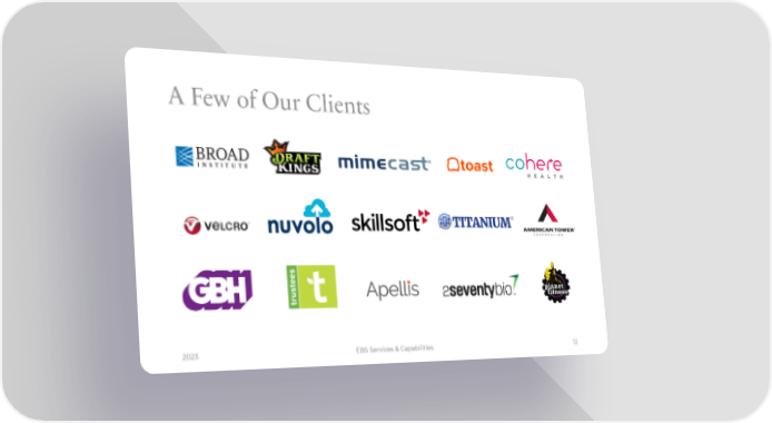 A Few of Our Clients 2023 EBS Services & Capabilities 12 Velcro Finalist Presentation Page 11 Page 13