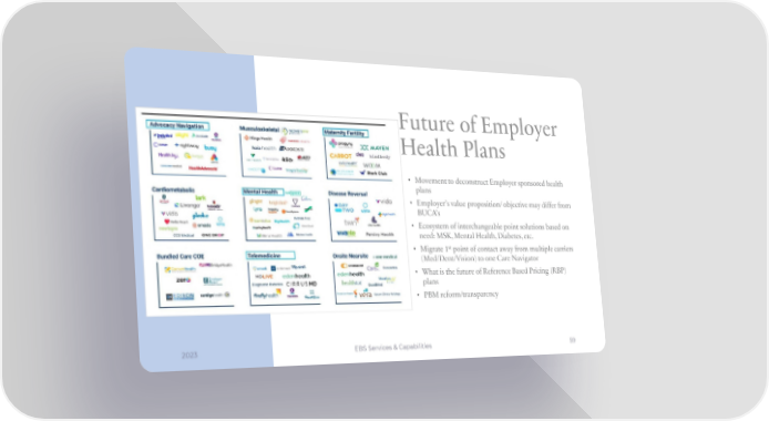 Future of Employer Health Plans • Movement to deconstruct Employer sponsored health plans • Employer’s value proposition/ objective may differ from BUCA’s • Ecosystem of interchangeable point solutions based on need: MSK, Mental Health, Diabetes, etc. • Migrate 1st point of contact away from multiple carriers (Med/Dent/Vision) to one Care Navigator • What is the future of Reference Based Pricing (RBP) plans • PBM reform/transparency 2023 EBS Services & Capabilities 59