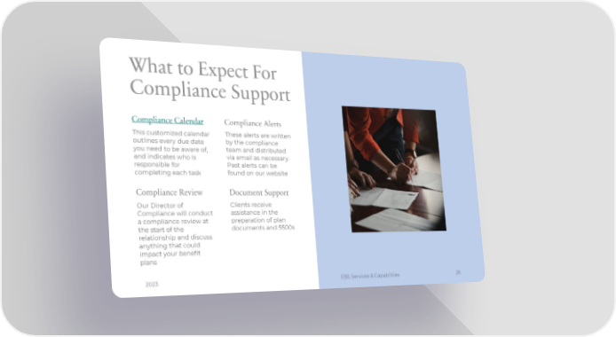 What to Expect For Compliance Support Compliance Calendar Compliance Alerts This customized calendar These alerts are written outlines every due date by the compliance you need to be aware of, team and distributed and indicates who is via email as necessary. responsible for Past alerts can be completing each task found on our website Compliance Review Document Support Our Director of Clients receive Compliance will conduct assistance in the a compliance review at preparation of plan the start of the documents and 5500s relationship and discuss anything that could impact your benefit plans 2023 EBS Services & Capabilities 26