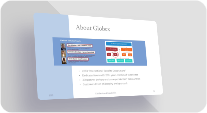 About Globex Globex Service Team Don Wiening –SVP –Practice Leader 25+ years int’l experience; has lived and worked in 4 countries; speaks German. Valentine Zimnitsky – Senior Consultant 20+ years int’l experience; worked in C&B departments of several Fortune 20 companies; speaks Russian, Ukrainian, Spanish. Kevin Boyce – Vice President 10+ years int’l experience; extensive experience with global plans. • EBS’s “International Benefits Department” • Dedicated team with 200+ years combined experience • 300 partner brokers and correspondents in 160 countries • Customer-driven philosophy and approach 2023 EBS Services & Capabilities 70