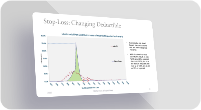 Stop-Loss: Changing Deductible Likelihood of Plan Cost Outcome as a Percent of Expected by Scenario 30.0% • Illustrates the risk of self 25.0% w/o SL funded plan cost outcome with and without stop loss insurance. 20.0% ns • With stop loss insurance o i t ($230K) the results lie very a rv e 15.0% tightly around the expected s b O l Base Case plan cost (100%), but for a a i r T few years in which the plan 10.0% runs up to 120% and as low as 70% of expected. 5.0% 0.0% % of Expected Plan Cost 2023 EBS Services & Capabilities 53