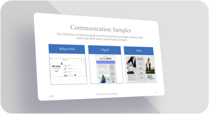 Communication Samples Our Director of Marketing & Communications provides clients with both pre-built and customized content Relayto Hub Digital Print 2023 EBS Services & Capabilities 24
