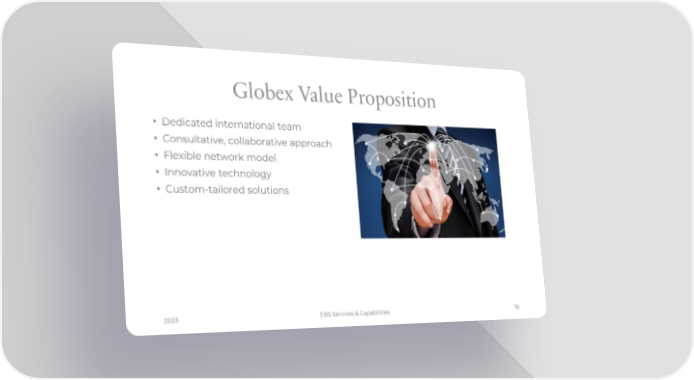 Globex Value Proposition • Dedicated international team • Consultative, collaborative approach • Flexible network model • Innovative technology • Custom-tailored solutions 2023 EBS Services & Capabilities 76