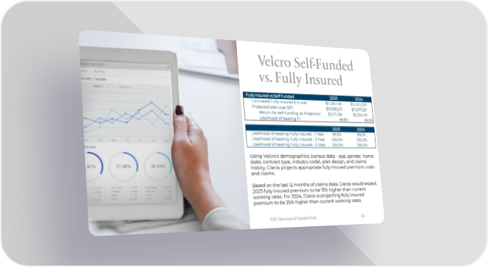 Velcro Self-Funded vs. Fully Insured Fully Insured vs Self Funded 2023 2024 Estimated Fully Insured (FI) cost $11,361,148 $12,351,339 Projected plan cost (SF) $10,190,011 $11,017,221 Return for self-funding at Projection $1,171,136 $1,334,119 Likelihood of beating FI 99.3% 99.3% 2023 2024 Likelihood of beating Fully Insured - 1 Year 99.3% 99.3% Likelihood of beating Fully Insured - 3 Year 100.0% 100.0% Likelihood of beating Fully Insured - 5 Year 100.0% 100.0% Using Velcro’s demographics (census data –age, gender, home state, contract type, industry code), plan design, and claims history, Claros projects appropriate fully insured premium costs and claims. Based on the last 12 months of claims data, Claros would expect 2023 fully insured premium to be 15% higher than current working rates. For 2024, Claros is projecting fully insured premium to be 25% higher than current working rates. 2023 EBS Services & Capabilities 52