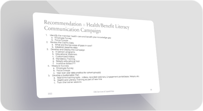 Recommendation = Health/Benefit Literacy Communication Campaign 1. Identify the member health care and benefit plan knowledge gap a. Employee Survey b. Focus Groups 2. Review the Claims Data a. What are the top areas of gaps in care? b. Establish baseline data 3. Develop and Deploy the Campaign a. In-person programs b. Educational Webinars c. Customized Videos d. Mandatory Training e. Relayto educational tool f. Incentive dollars??? 4. Measure Success a. Employee Survey b. Focus Groups c. Year over year data analtics for cohort group(s) 5. Develop a Sustainable Plan a. Real-time training tools – videos, recorded webinars, Engagement portals/apps, Relayto, etc. b. Healthcare Literacy Training as part of new hire c. Train the trainer sessions 2022 EBS Services & Capabilities 58