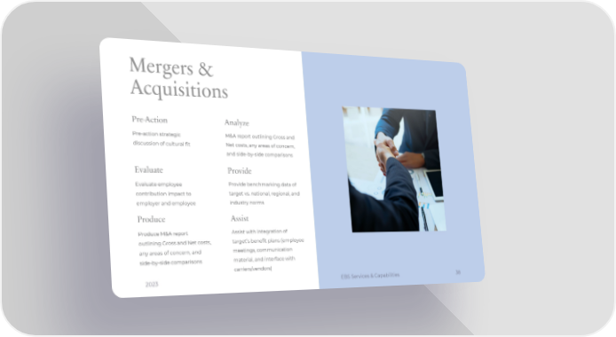 Mergers & Acquisitions Pre-Action Analyze Pre-action strategic M&A report outlining Gross and discussion of cultural fit Net costs, any areas of concern, and side-by-side comparisons Evaluate Provide Evaluate employee Provide benchmarking data of contribution impact to target vs. national, regional, and employer and employee industry norms Produce Assist Produce M&A report Assist with integration of outlining Gross and Net costs, target’s benefit plans (employee any areas of concern, and meetings, communication side-by-side comparisons material, and interface with carriers/vendors) 2023 EBS Services & Capabilities 38