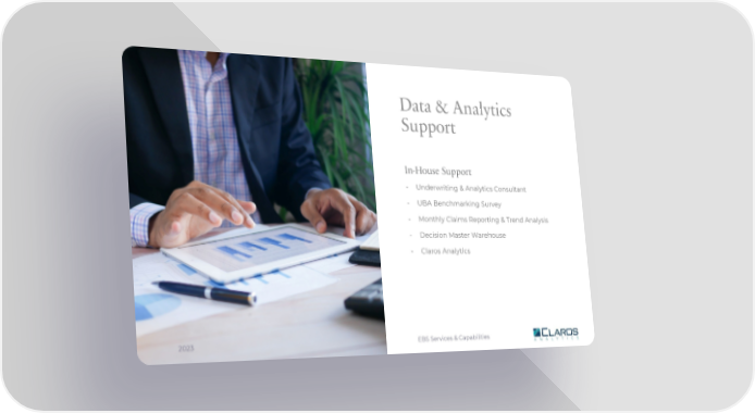 Data & Analytics Support In-House Support - Underwriting & Analytics Consultant - UBA Benchmarking Survey - Monthly Claims Reporting & Trend Analysis - Decision Master Warehouse - Claros Analytics 2023 EBS Services & Capabilities